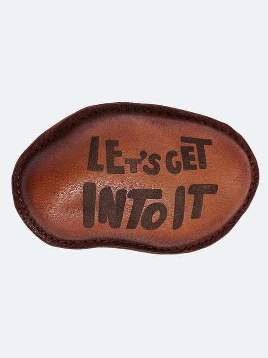 A playful desk accessory crafted from genuine leather, etched with the bold phrase “Let’s Get...