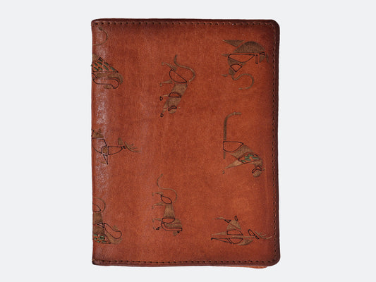 A versatile pouch crafted from supple brown leather, featuring laser-printed animal figures that add rhythm...