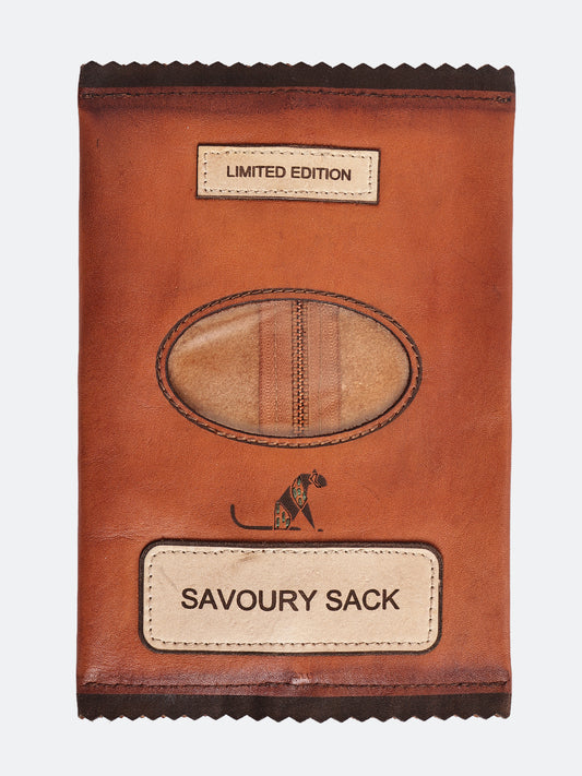 A collectible pouch crafted to resemble a classic snack sack. Made from genuine tan leather...