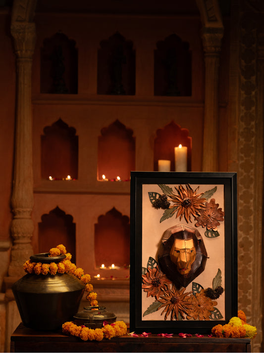 Description - This handcrafted wall art features a lion’s face sculpted in a geometric style,...