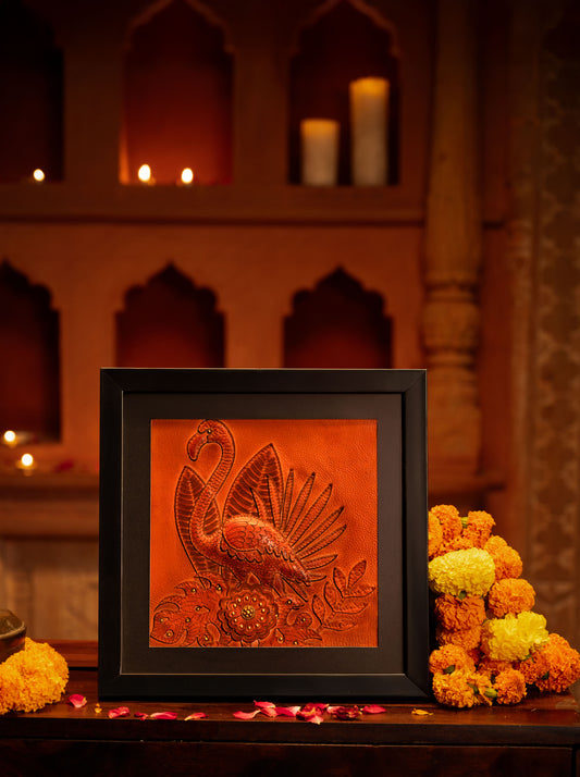 This artwork captures the regal elegance of a peacock through embossed leather, highlighted with floral...