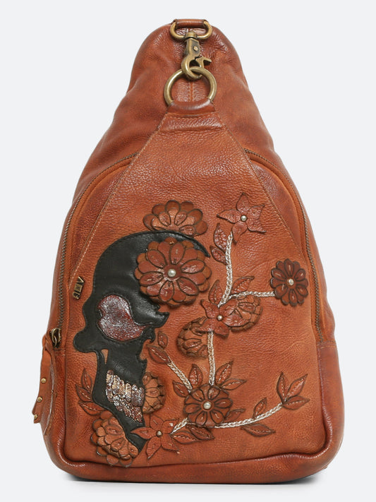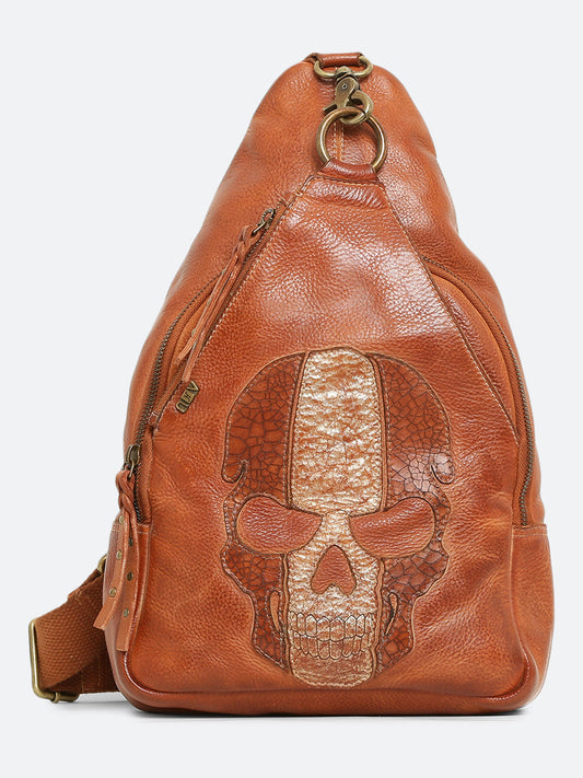 A leather crossover backpack for bikers, made with high-quality leather with a patchwork of a...