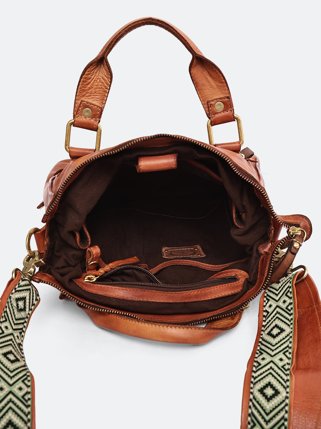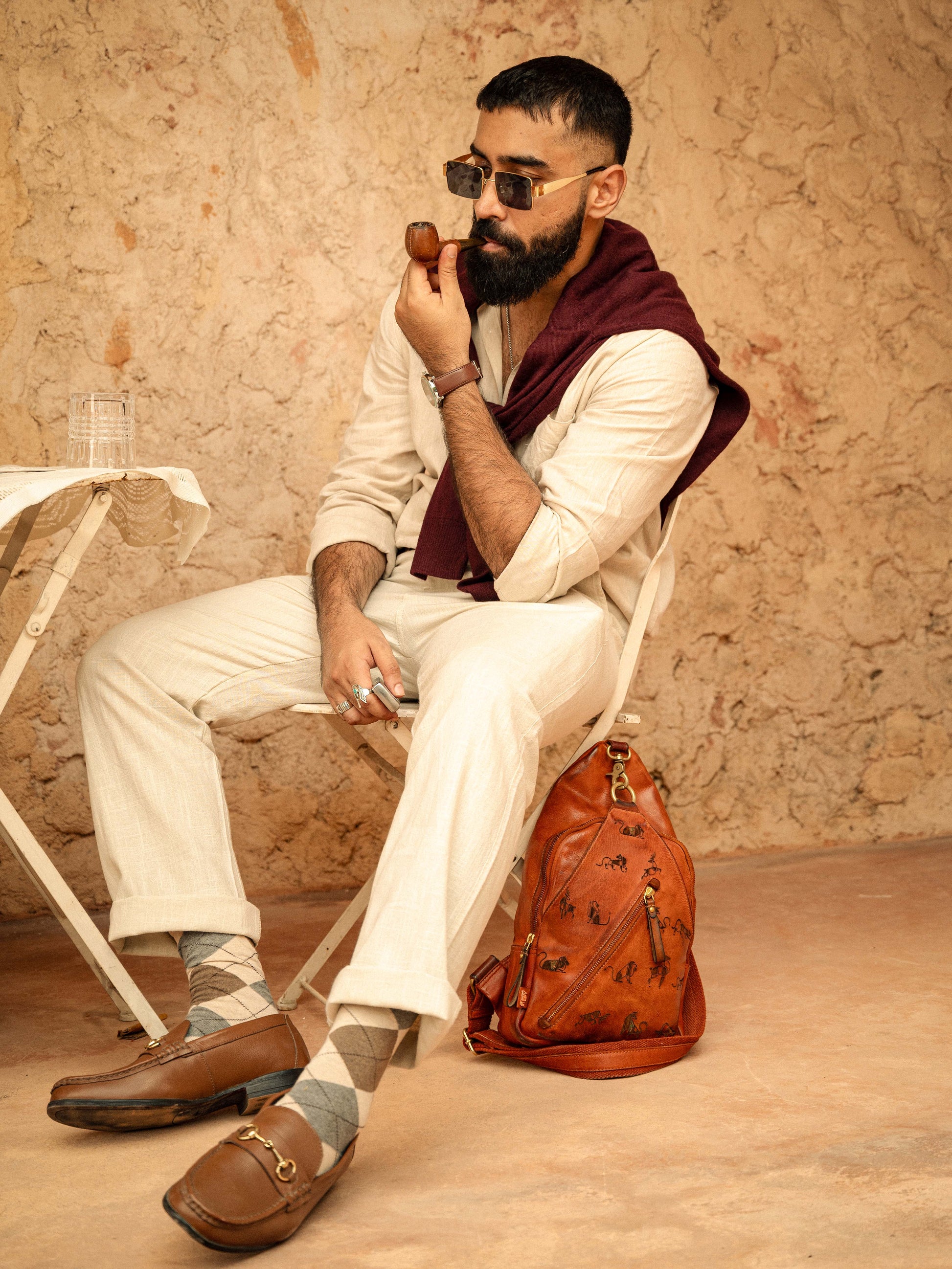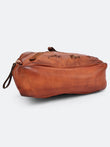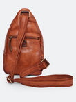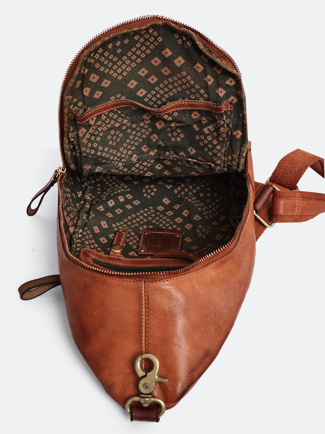 The triangular silhouette offers a contemporary twist, combining the ease of a sling with the space of a small backpack. Its diagonal zip opening adds functional flair, while the brass hardware completes its rugged yet elegant appeal.