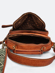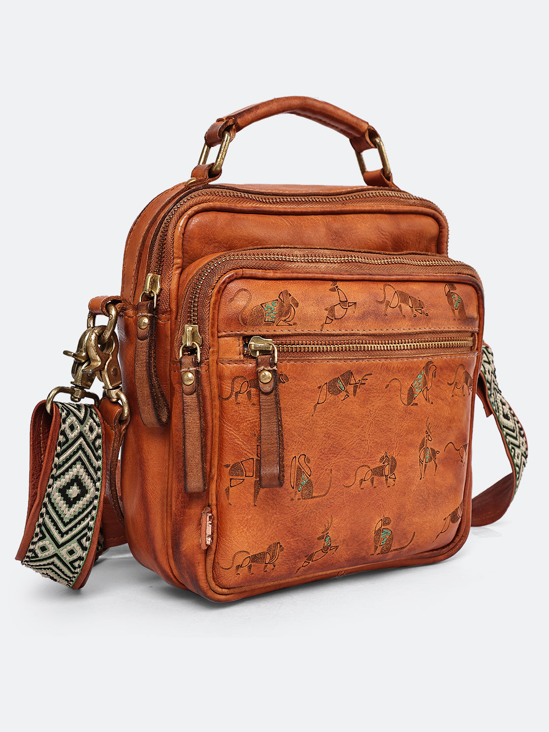 The Large Crossbody from the 40/41 Collection captures the brand’s philosophy — functionality shaped by craft. The soft, washed leather carries etched animal motifs, each handcrafted with intricate color work that celebrates movement. The piece’s bold woven strap adds structure and rhythm, a visual cue of strength and style.