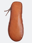 Each piece is hand-finished and burnished to achieve a rich, warm tone that ages beautifully. The minimal form opens with a zip closure, while the interior is lined with smooth fabric to protect your slippers or travel shoes. Whether carried solo or slipped into a suitcase, it maintains its refined silhouette.