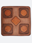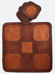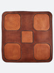 Four rounded coasters nest perfectly within the square base, secured in recessed grooves that balance design symmetry with function. The central diamond accent adds a subtle architectural flair. Each coaster is treated to resist moisture while maintaining a natural leather feel.