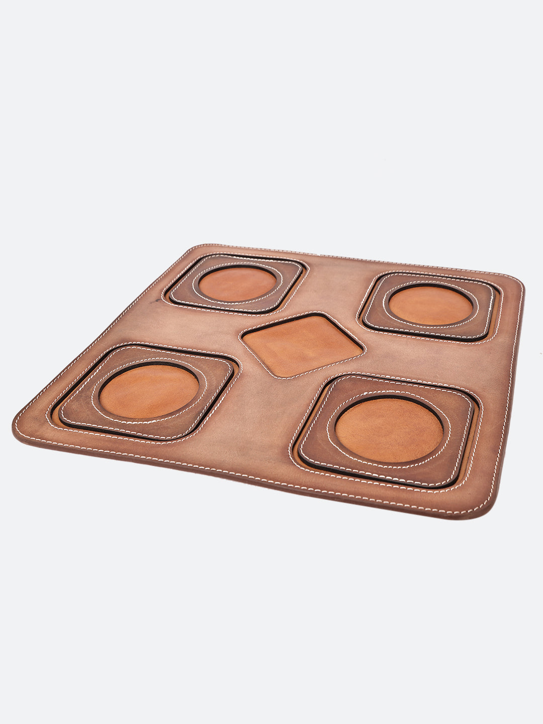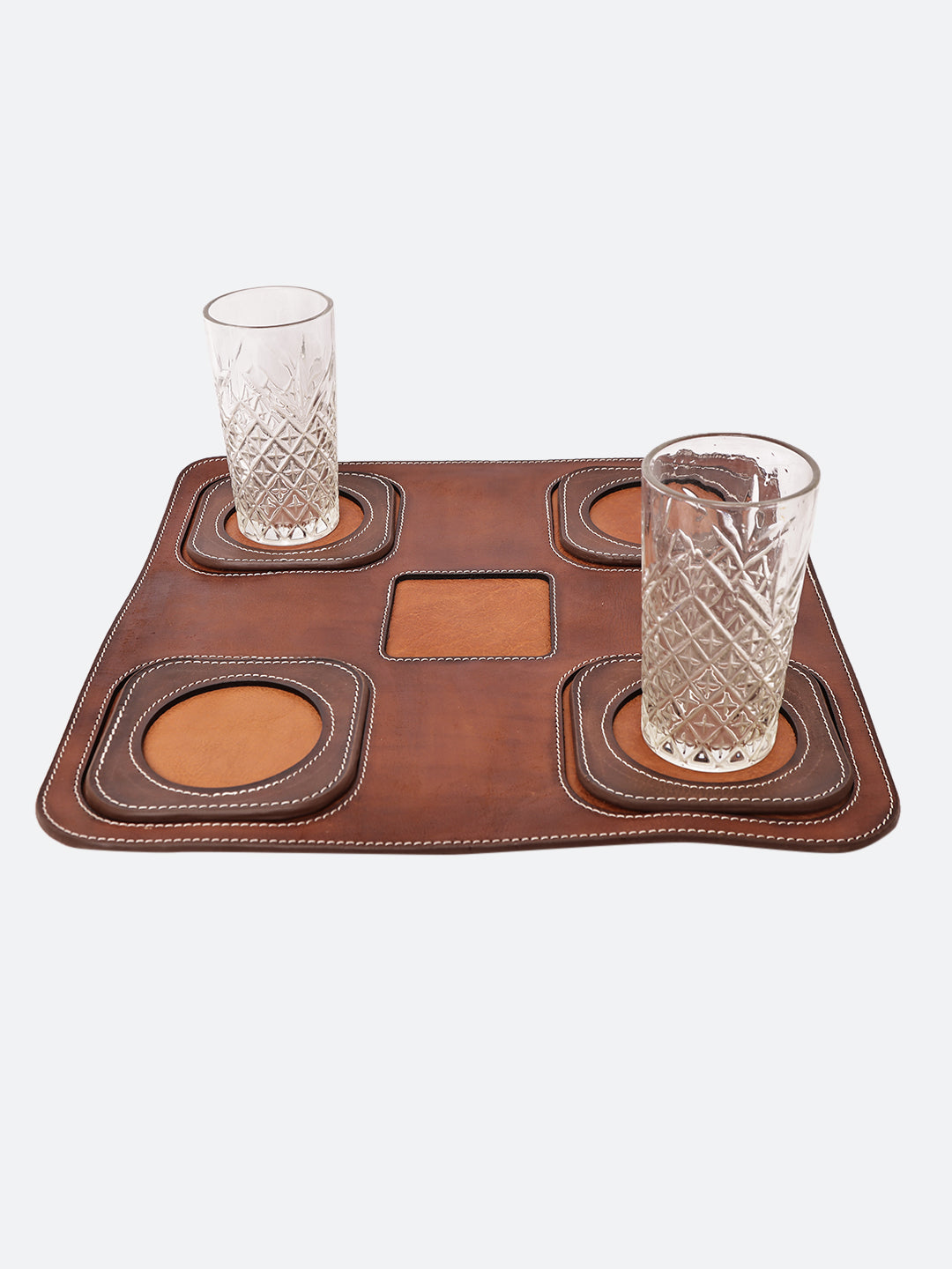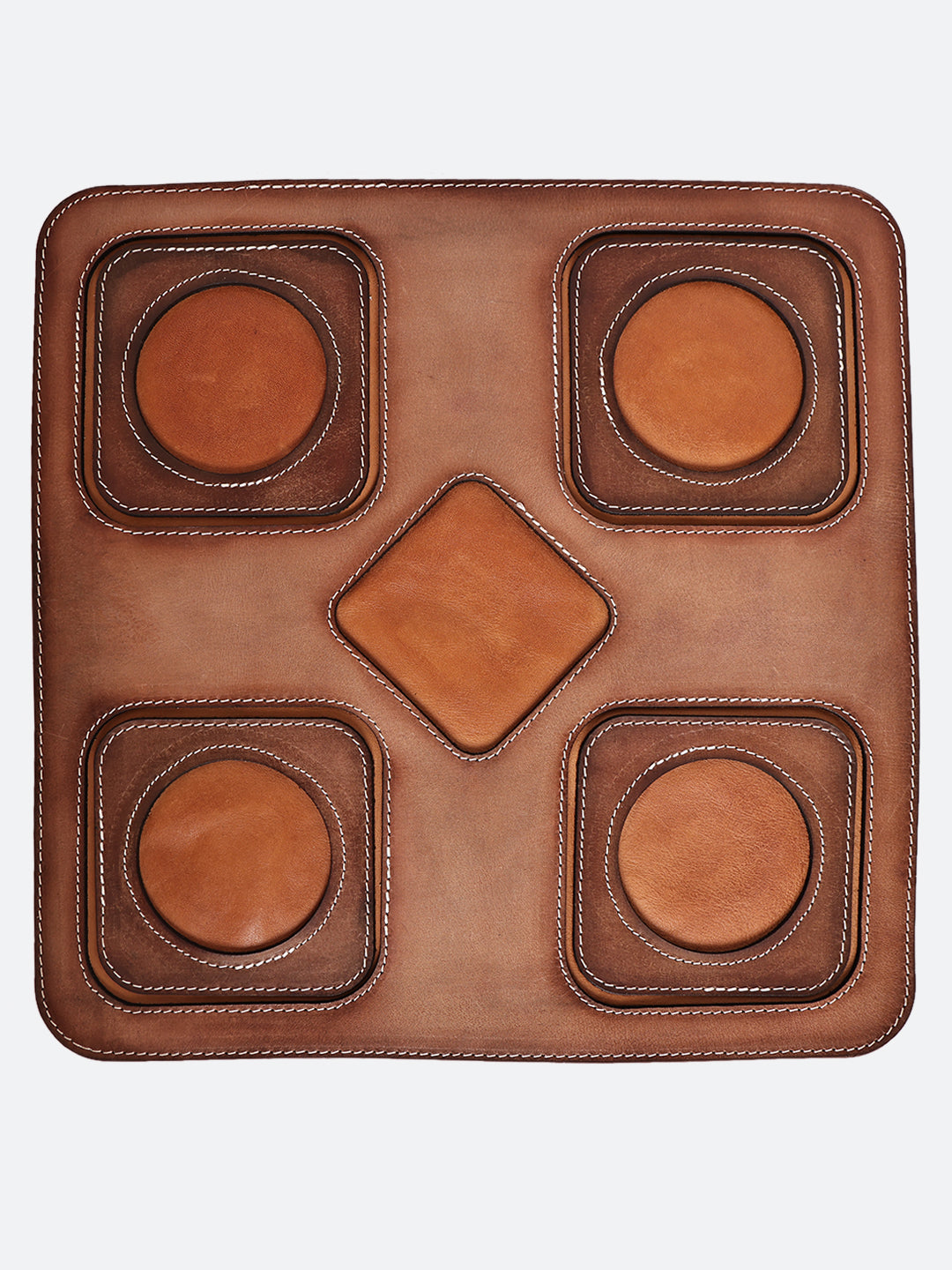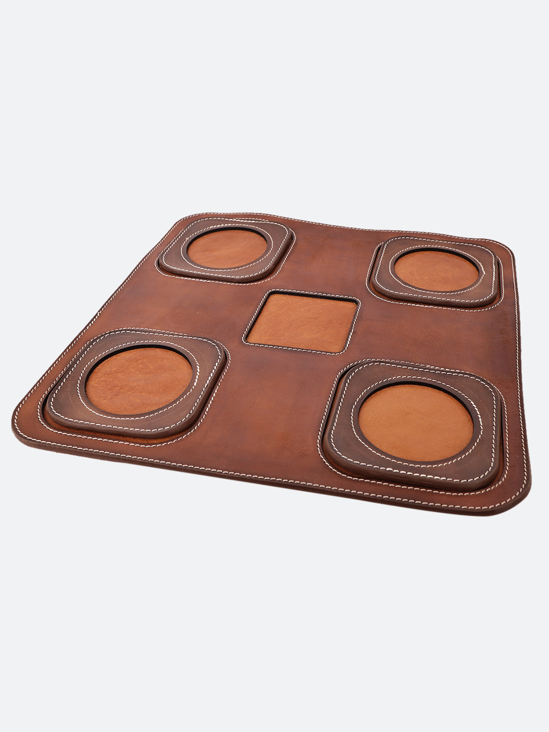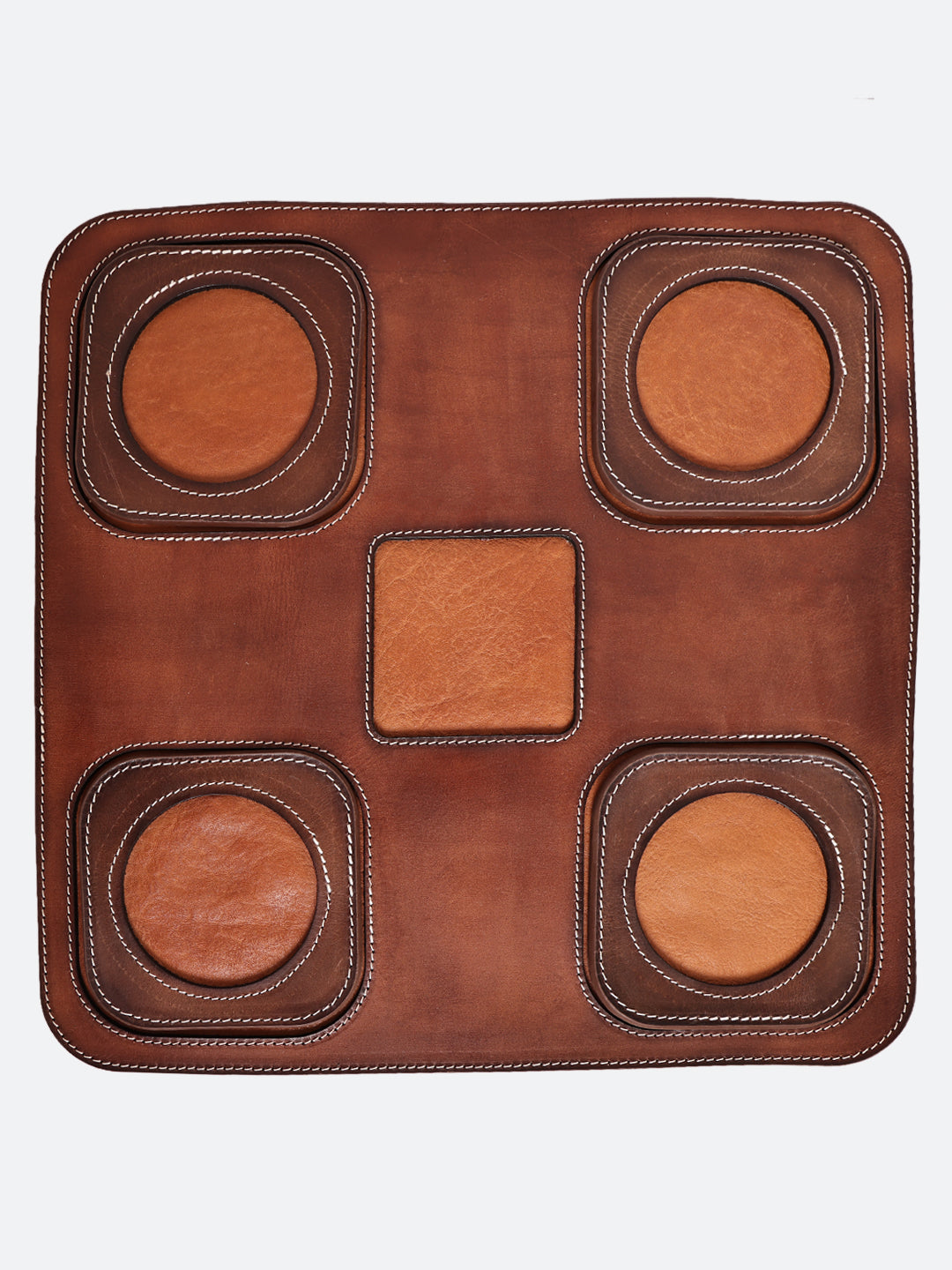 The 40/41 “Tavern Set” redefines tabletop sophistication with a handcrafted leather coaster base that embodies both utility and art. Made from fine-grain brown leather, its smooth texture is accentuated by precise white stitching and layered panels — a testament to expert leatherwork.