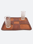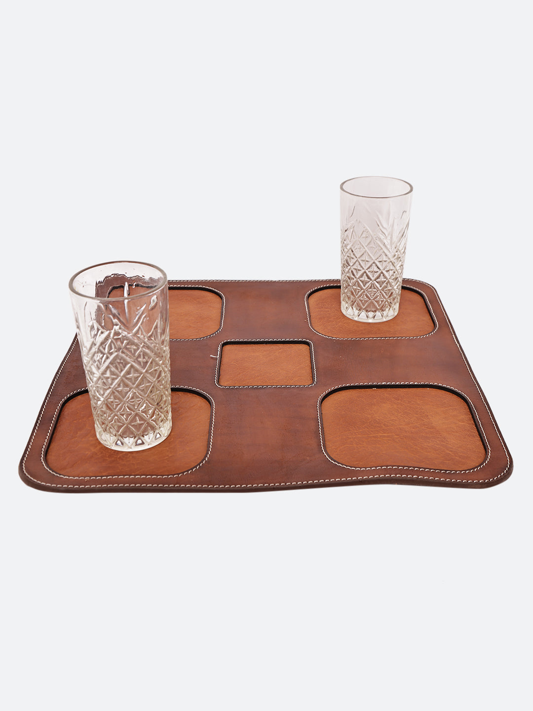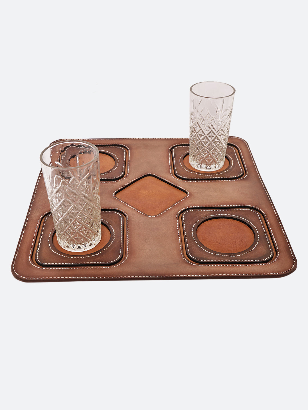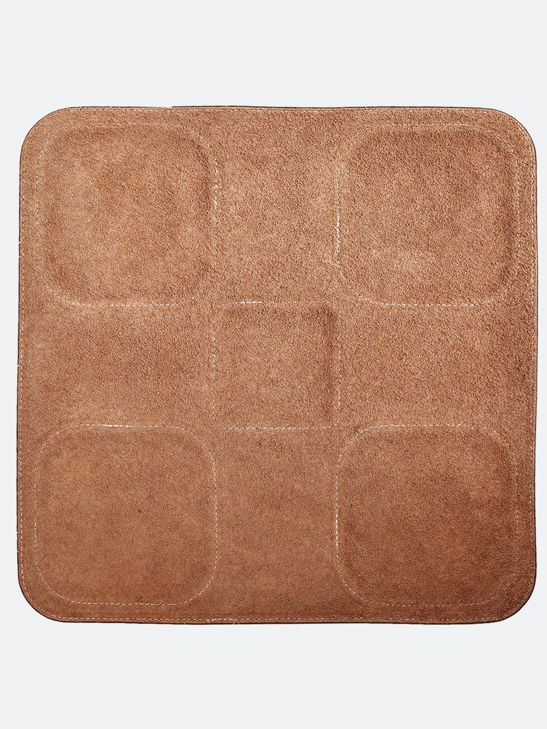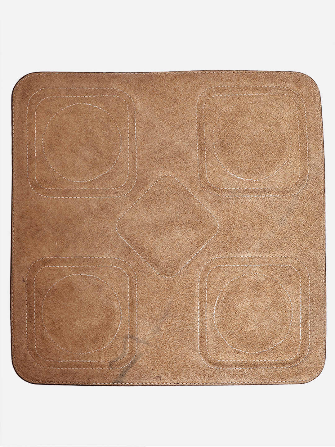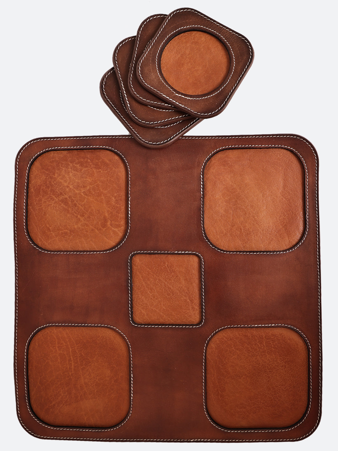 The 40/41 “Tavern Set” redefines tabletop sophistication with a handcrafted leather coaster base that embodies both utility and art. Made from fine-grain brown leather, its smooth texture is accentuated by precise white stitching and layered panels — a testament to expert leatherwork.