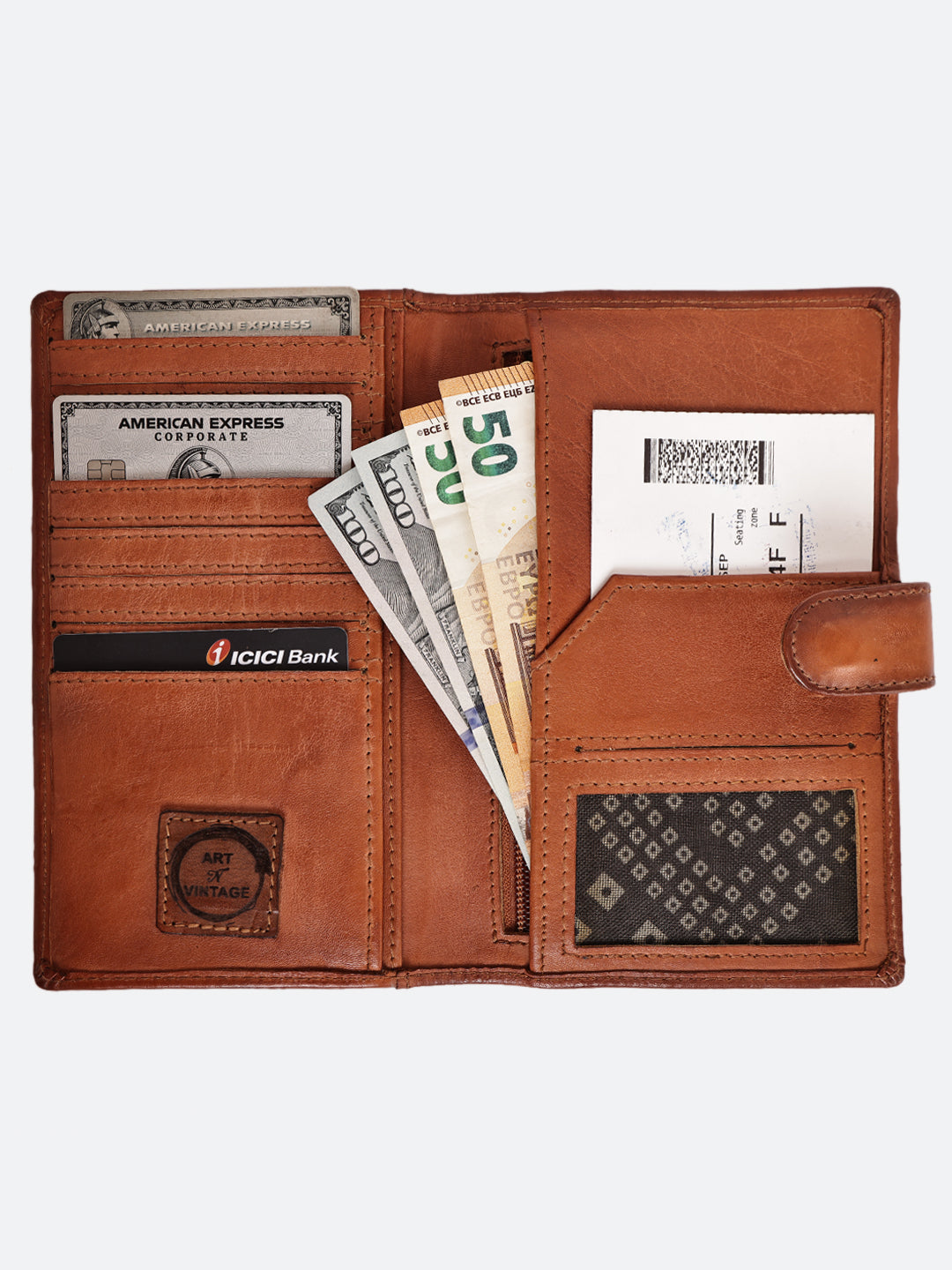 Inside, dedicated compartments for passports, boarding passes, cards, and currency keep essentials secure and easily accessible. The flap closure with a leather clasp enhances both style and safety.