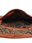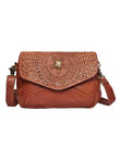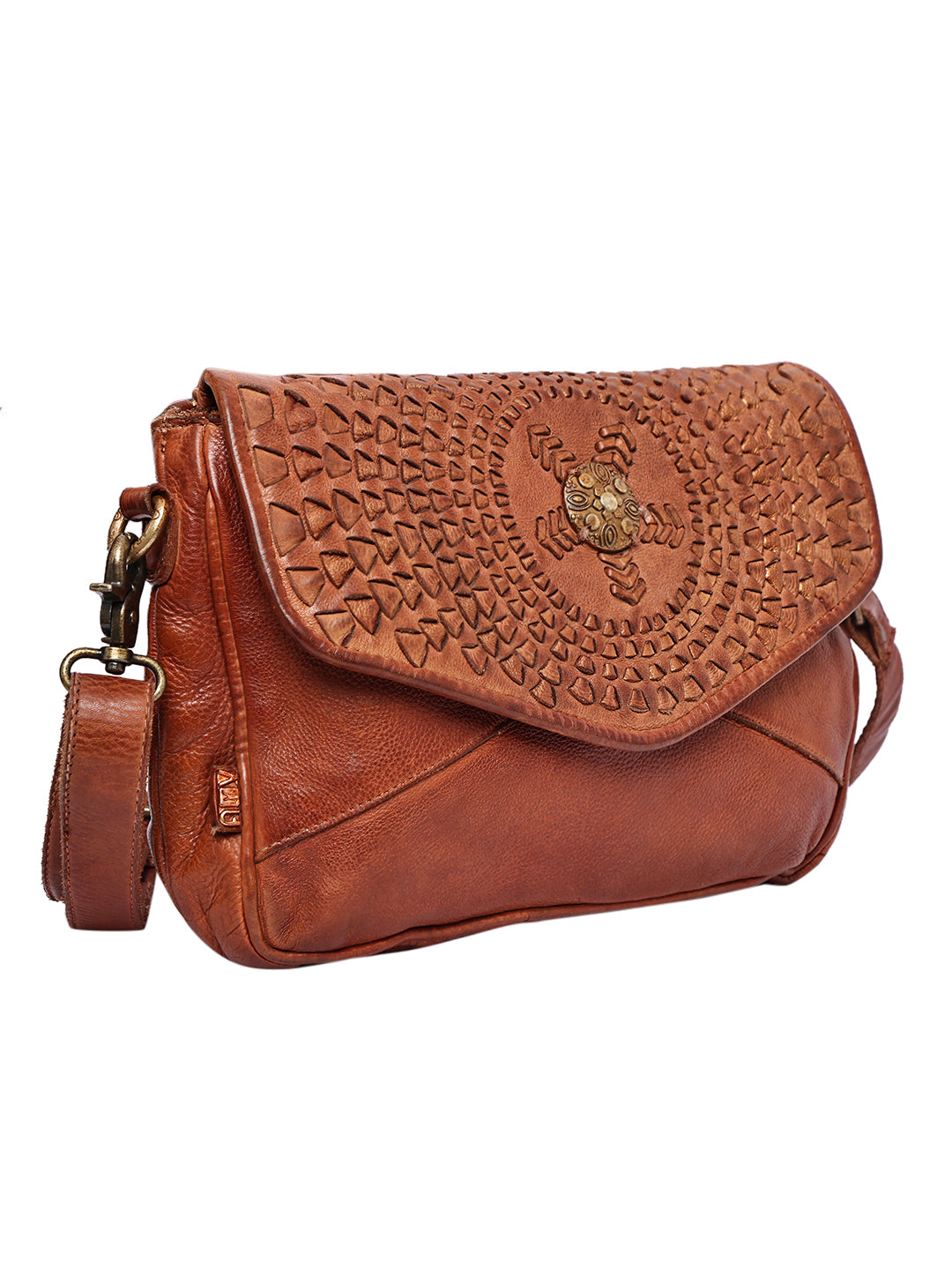 The Aria Sling Bag is a perfect blend of traditional craftsmanship and everyday elegance. Handcrafted from premium genuine leather in a rich cognac tone, this bag features intricate hand-carved detailing on the front flap that adds a distinctive artisanal charm.