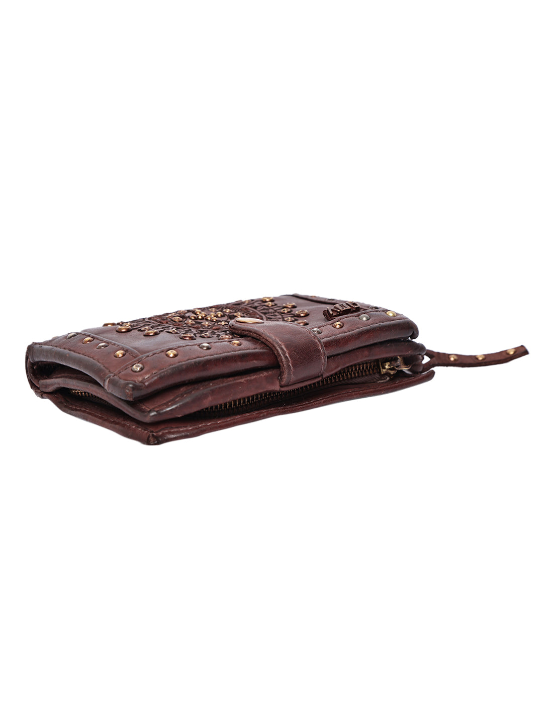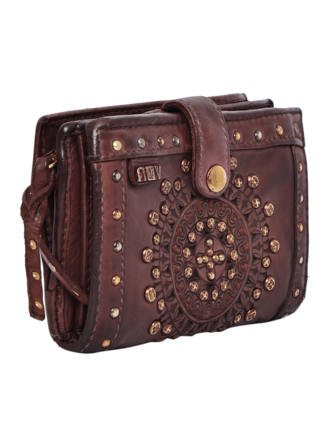 The front is beautifully adorned with an embossed mandala design, highlighted by antique-finish metal studs that give it a bold and artistic look. Designed for everyday convenience, the wallet offers well-organized compartments for cash, cards, and essentials, secured with a sturdy snap-button closure.