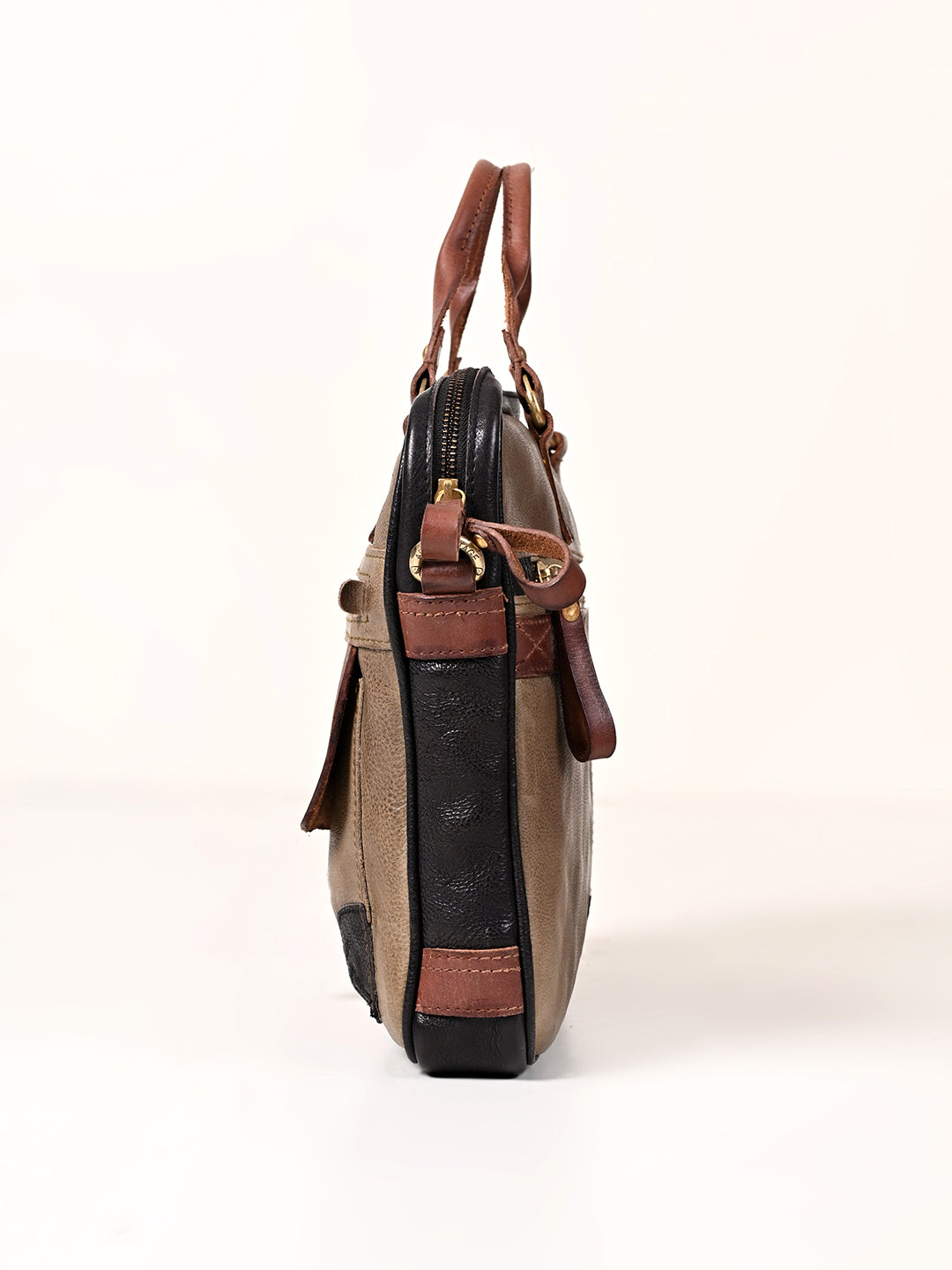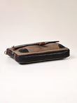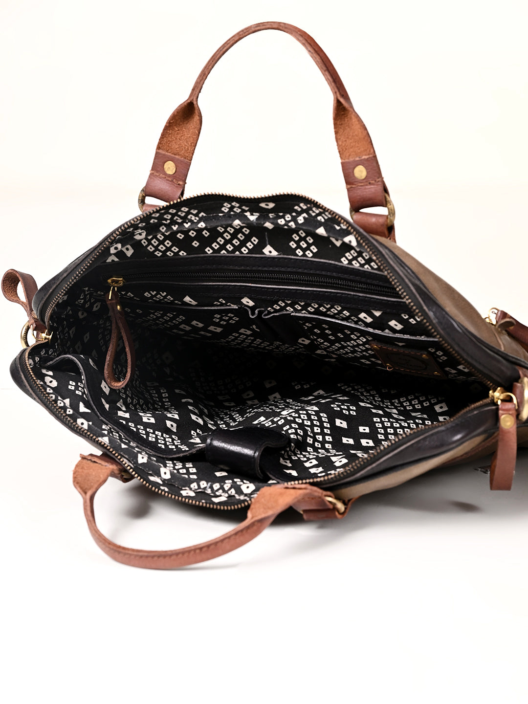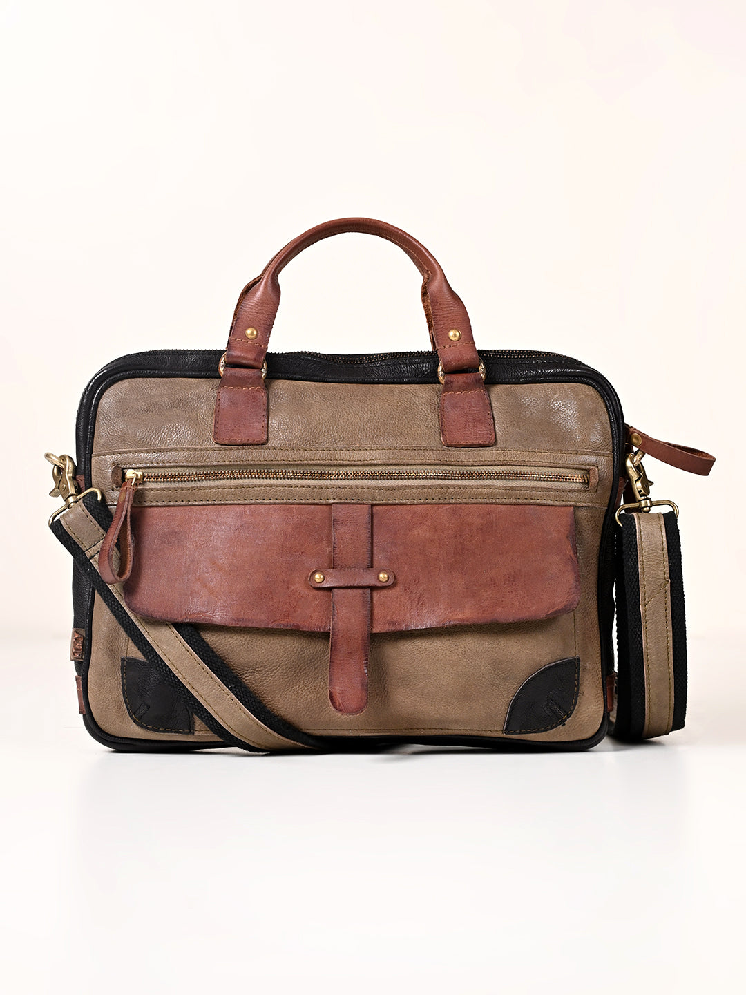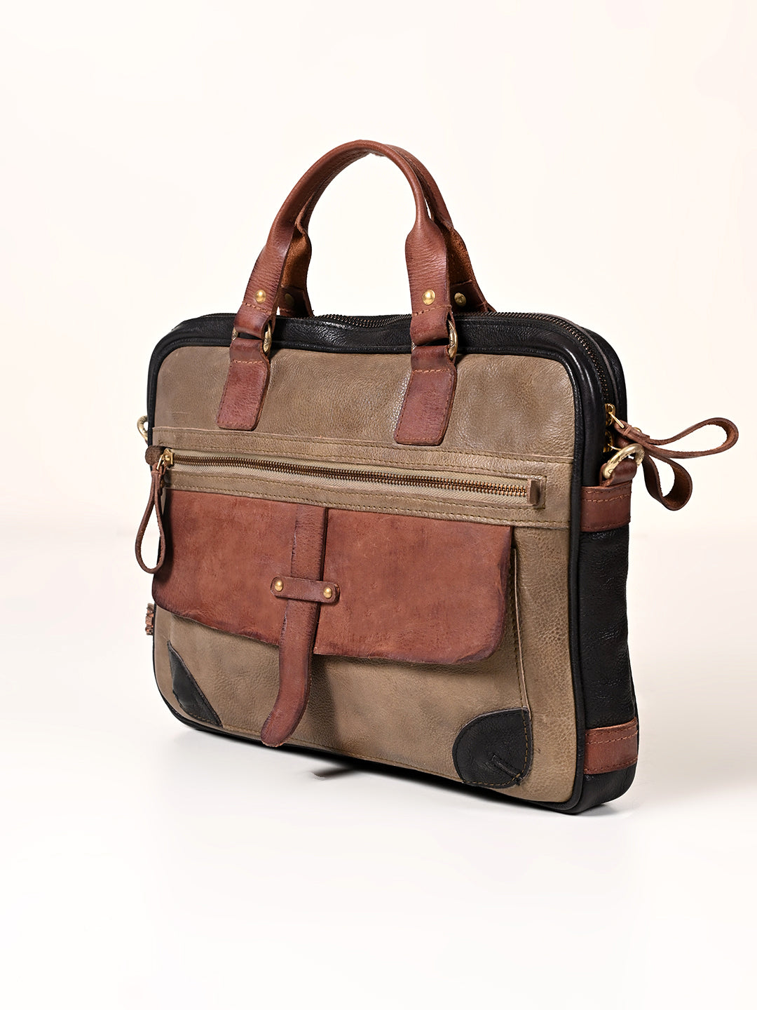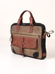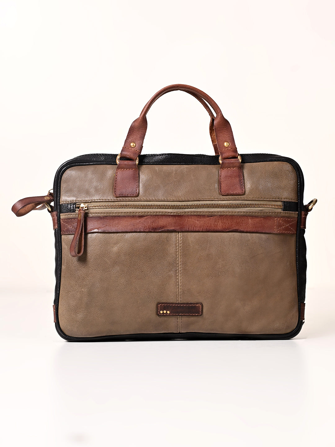 This olive and black leather laptop bag is crafted from 100% real leather, offering durability and a sleek look. The main compartment with a dedicated laptop sleeve keeps your device safe and organized, making it ideal for work or travel.