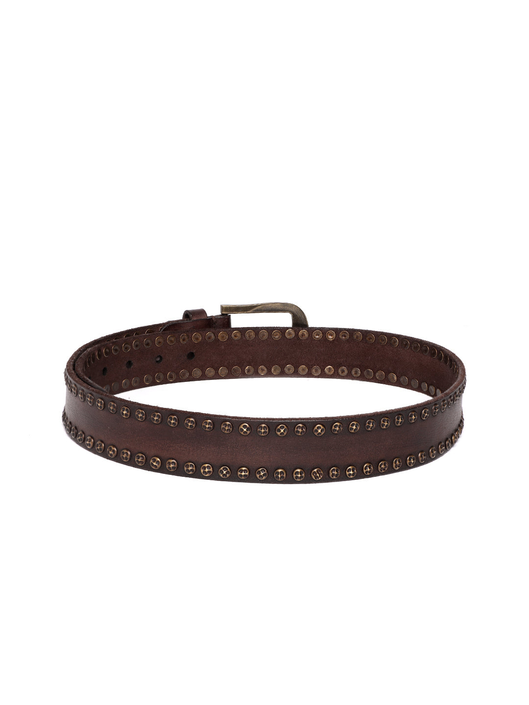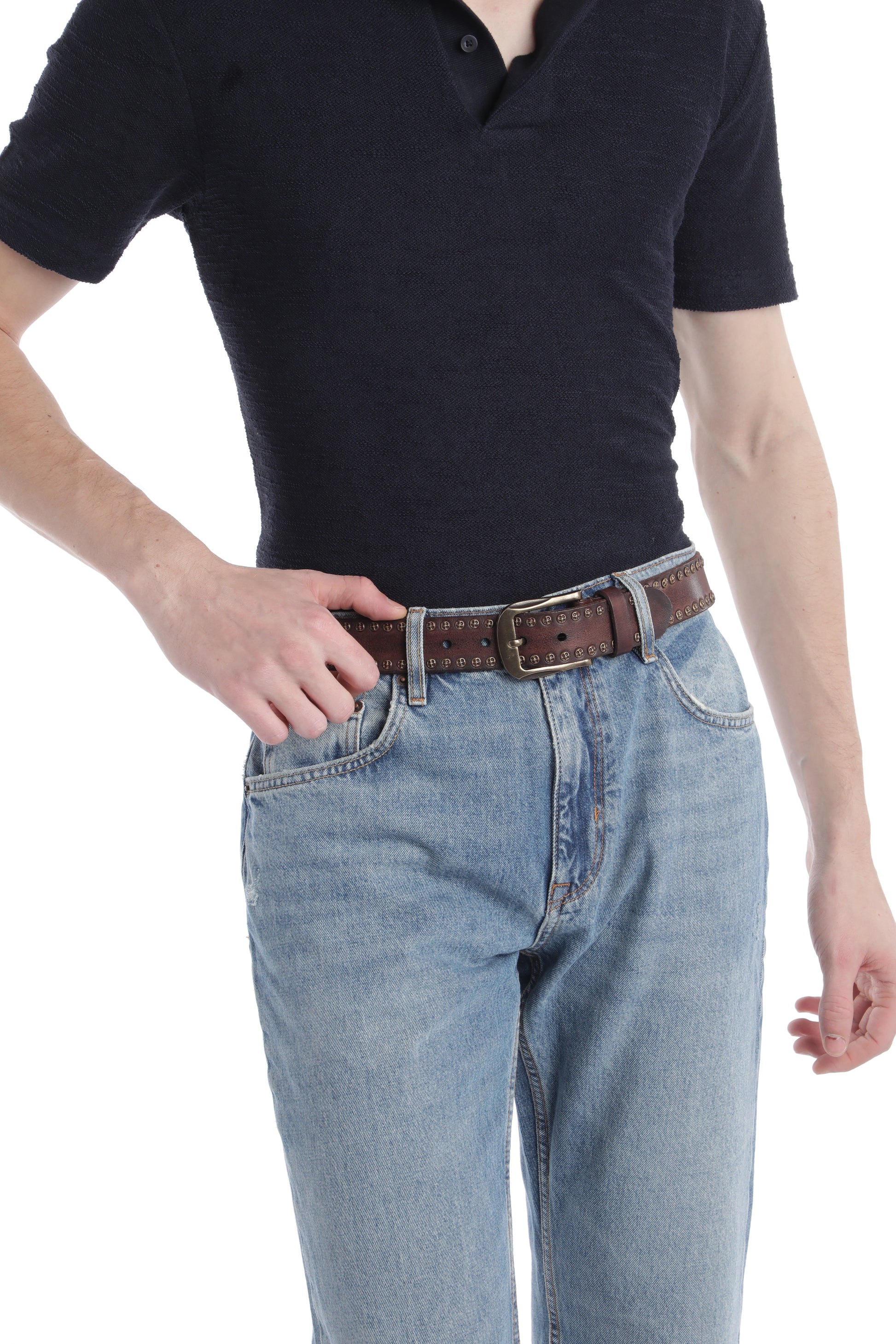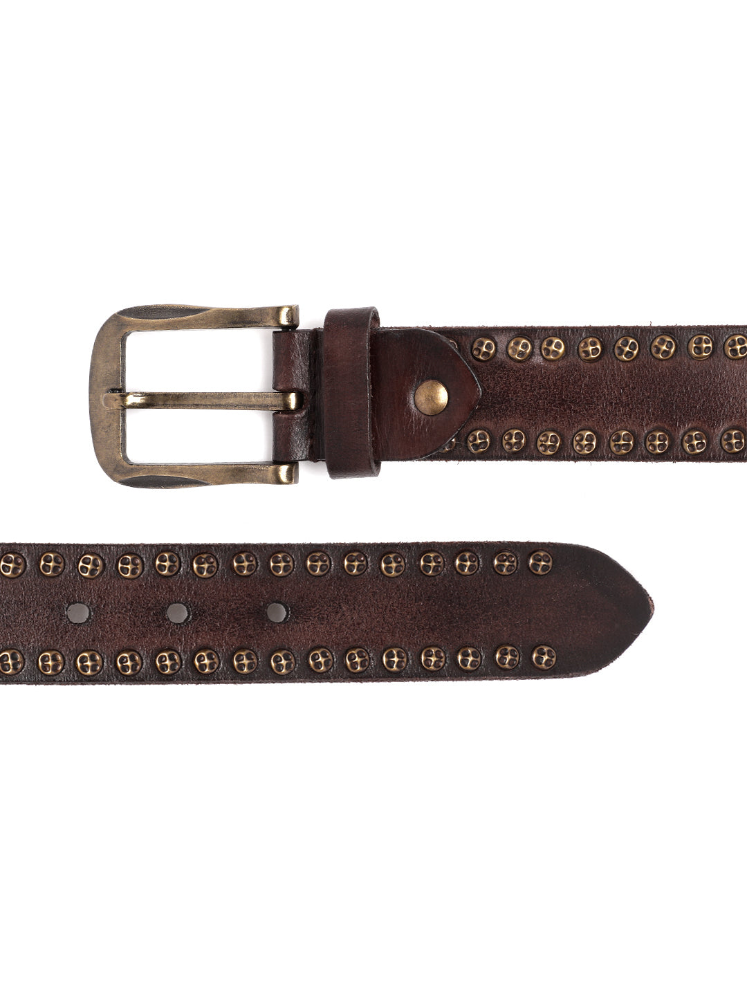 Inspired by vintage aesthetics, this belt is crafted from rich, textured leather in a warm brown hue. The traditional buckle and brass or gold-toned studs along the strap add a touch of rugged charm. Ideal for adding a unique, stylish edge to casual or smart-casual ensembles