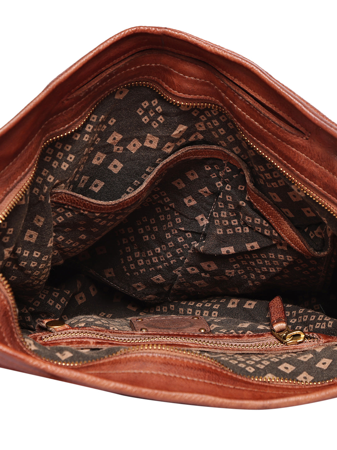 The bag features a spacious main compartment with a premium printed fabric lining that keeps your essentials organized, while the inner zip pocket and back zipper pocket offer secure storage for valuables.