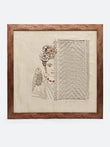 The right side showcases an intricately woven leather texture, symbolizing heritage craftsmanship and tactile beauty, while the illustrated figure on the left reflects grace, creativity, and vintage charm. Finished with a solid wooden frame, this artwork adds warmth, depth, and character to any interior space.