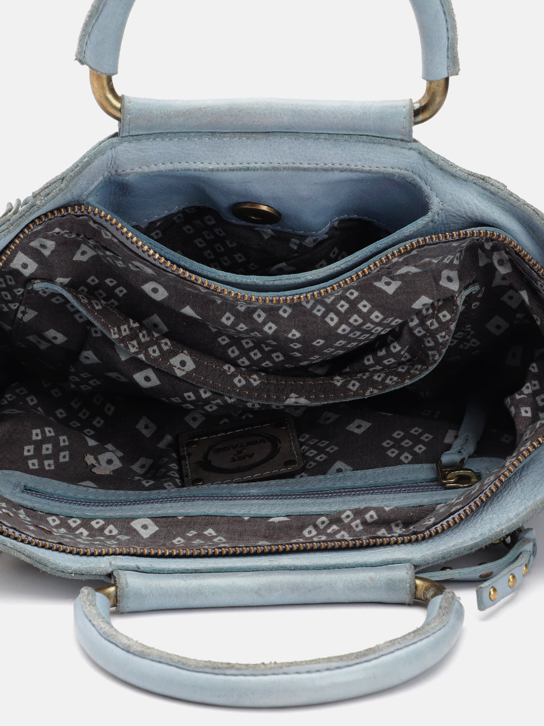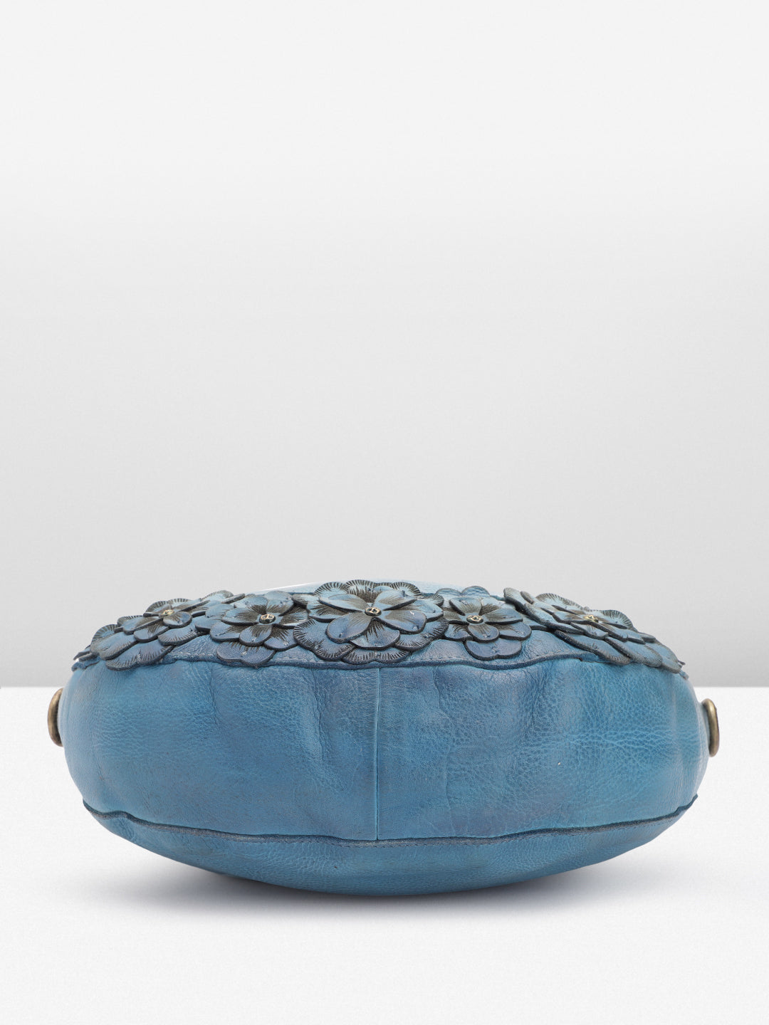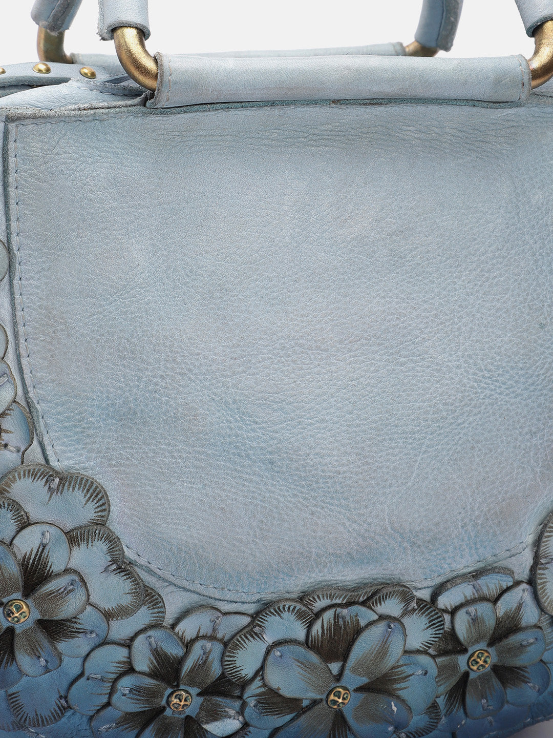 Product Detail: · Material: 100% Leather · Lining: 100% Cotton · Metal Fittings: Old English brass · Technique: Flower Applique Riveting · Dimension (LxWxH)cm: 20x7x29 |