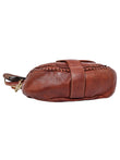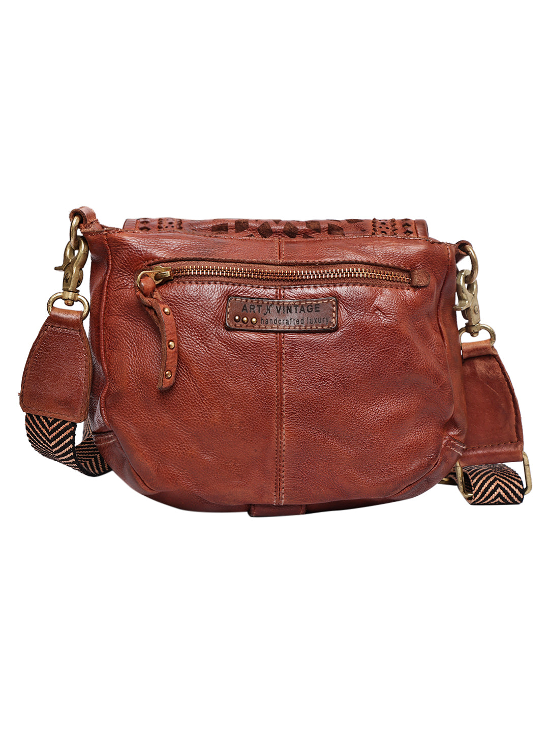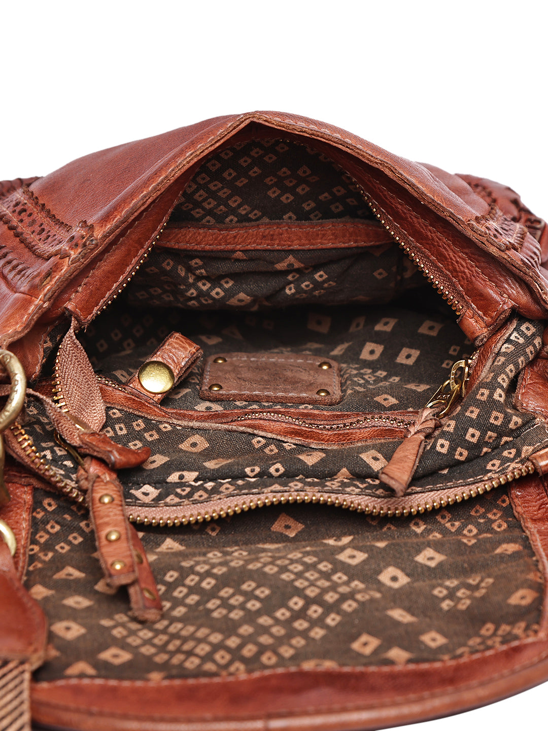 Designed in a rich cognac brown shade, it showcases a vintage hand-finished texture that ages gracefully over time. The spacious main compartment is lined with premium printed fabric and secured with an inner zip closure, ensuring your essentials stay safe and organized. A back zip pocket adds extra convenience for quick-access items.