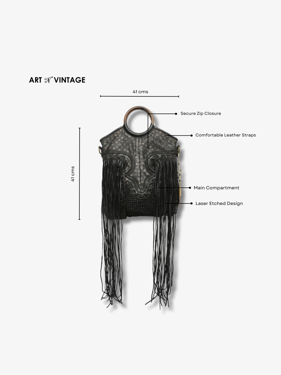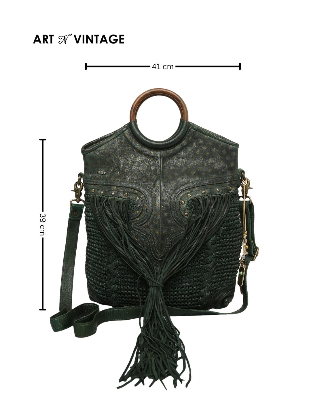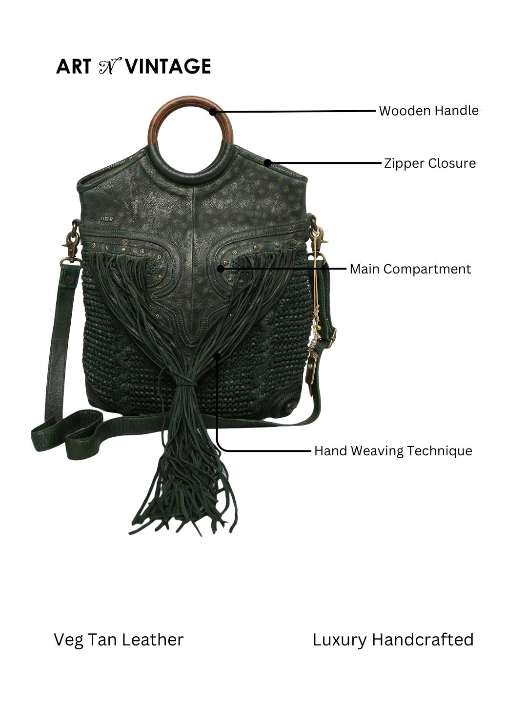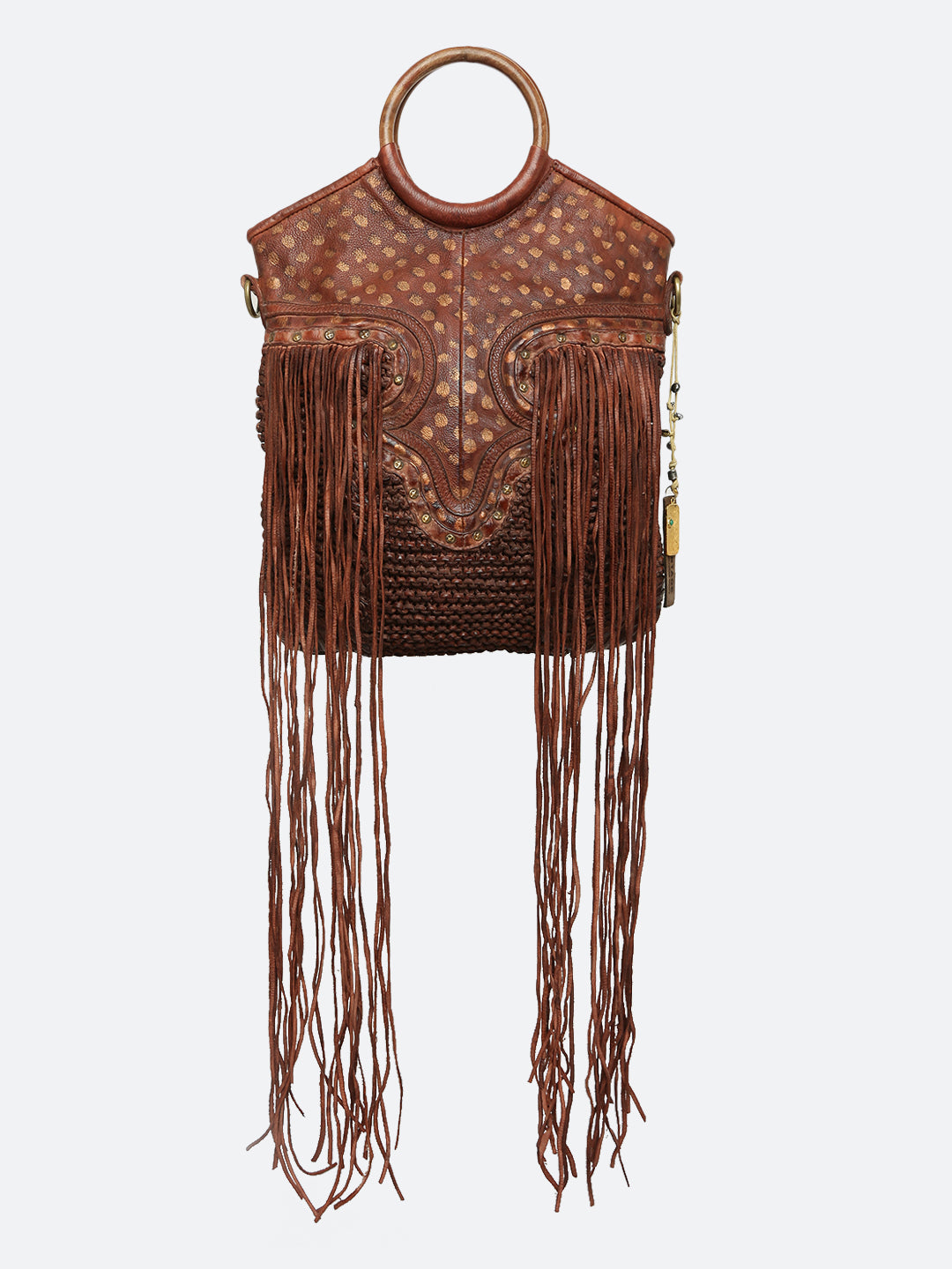 The round wooden handle tote has a main compartment consisting of an inner zip pocket, mobile pocket, slip pocket, and a key holder. An adjustable and detachable handle makes it easy to carry in different ways. This printed and woven boho-fringed style is fashionable workwear to a mundane day. Pep up your look with this stylish bag on a casual day.