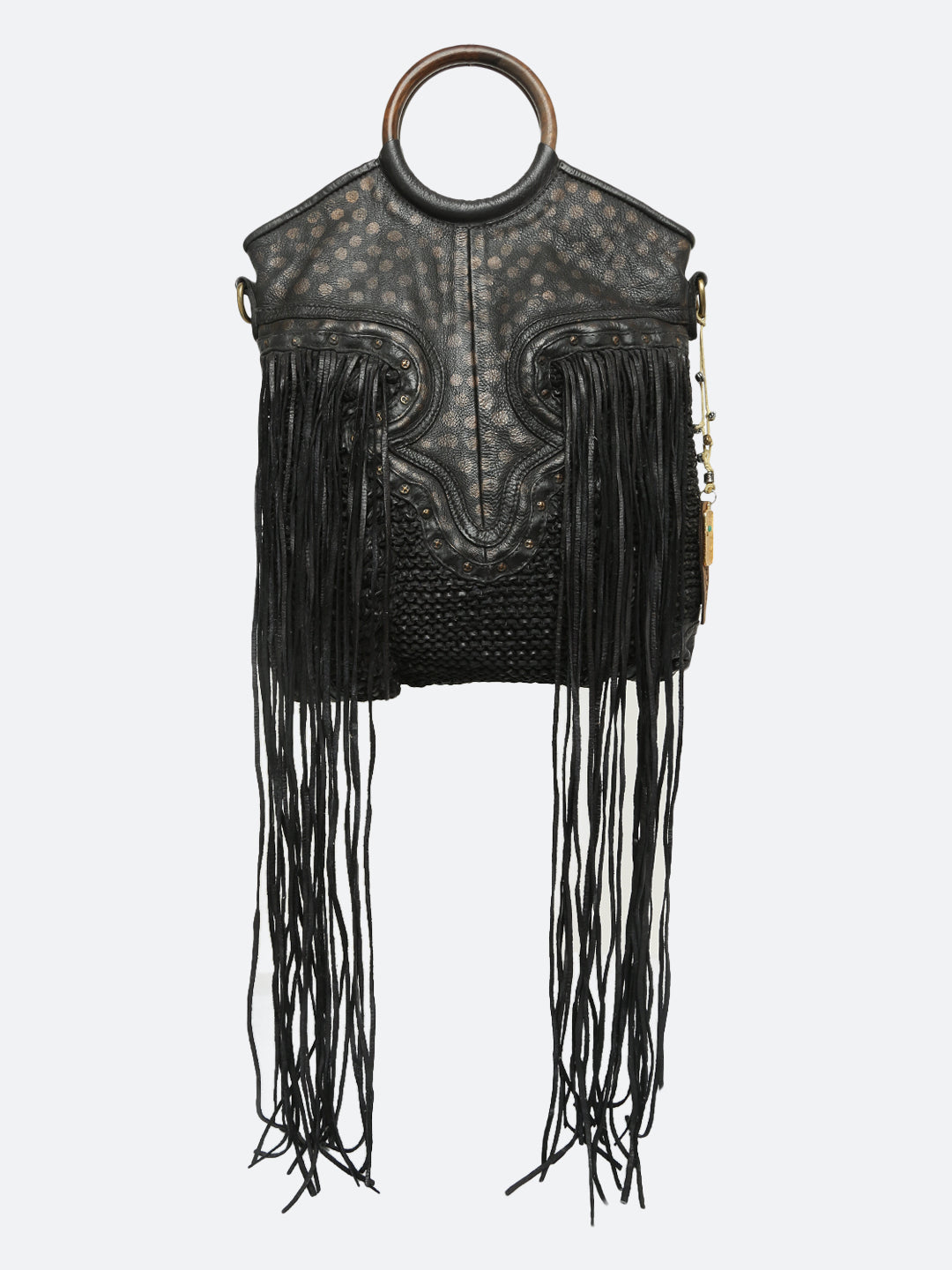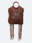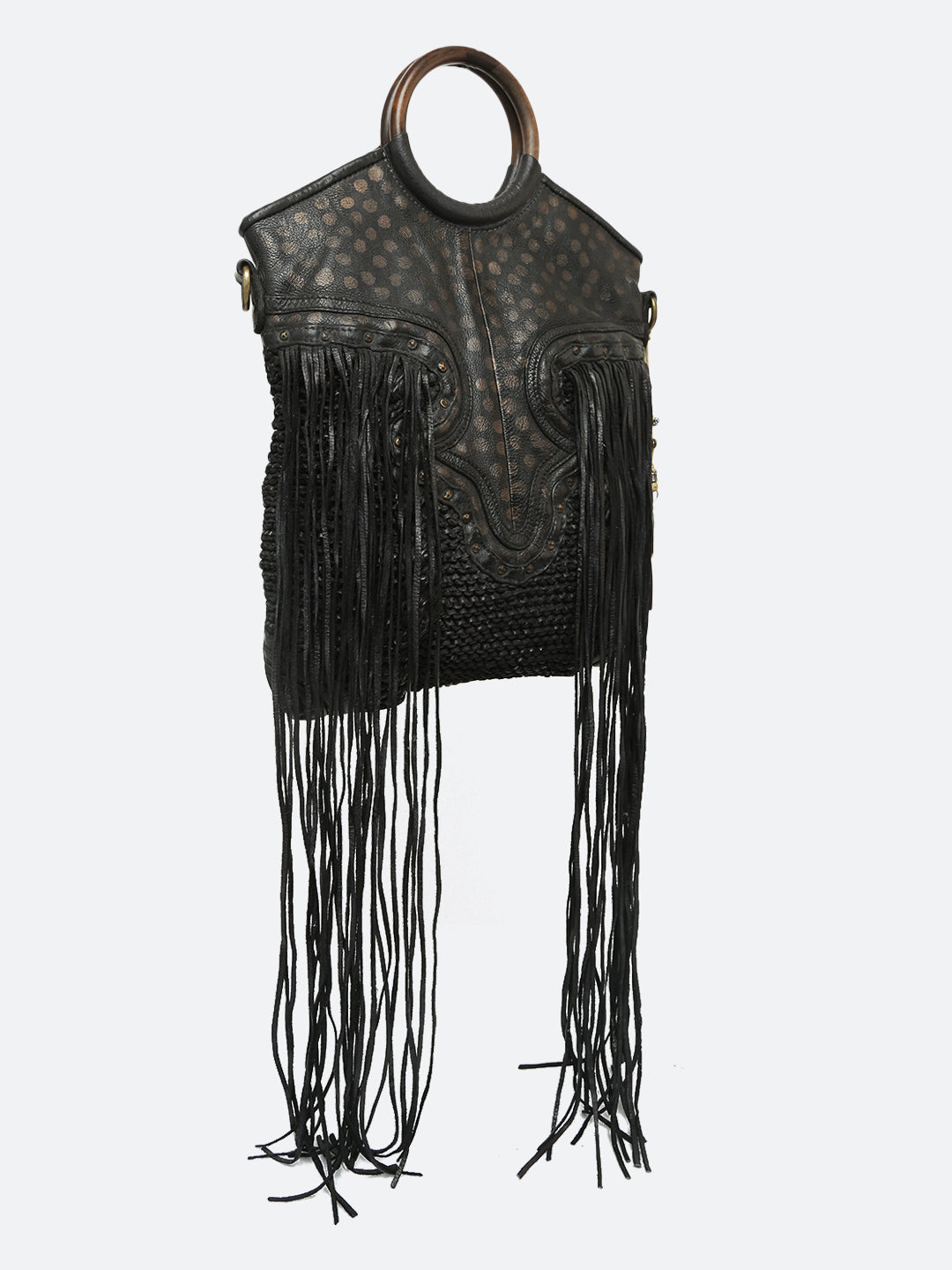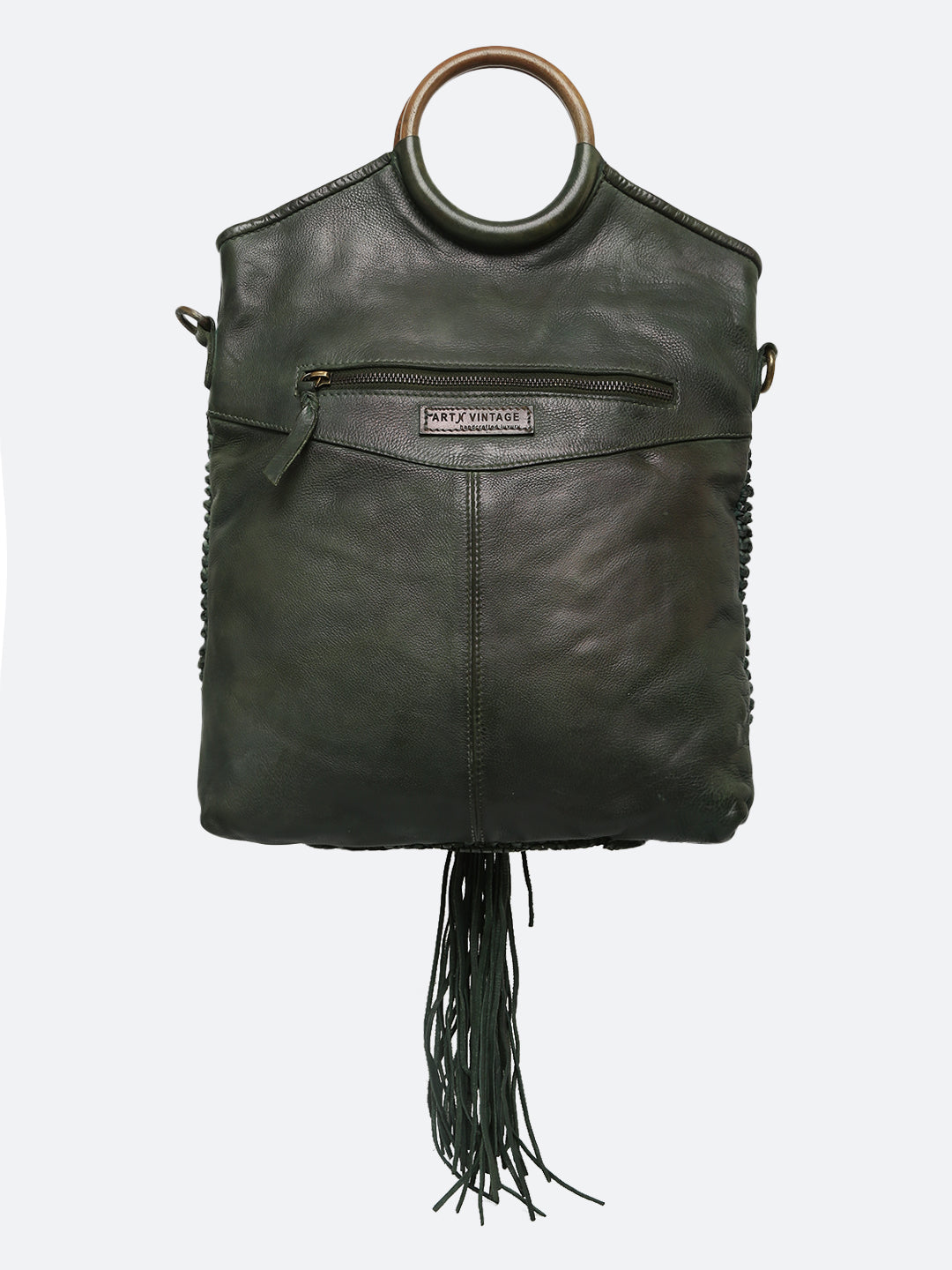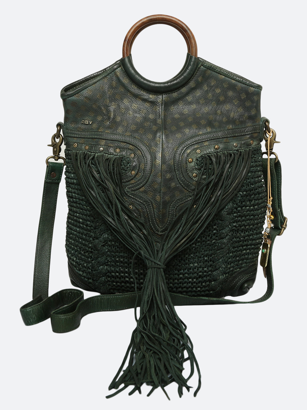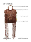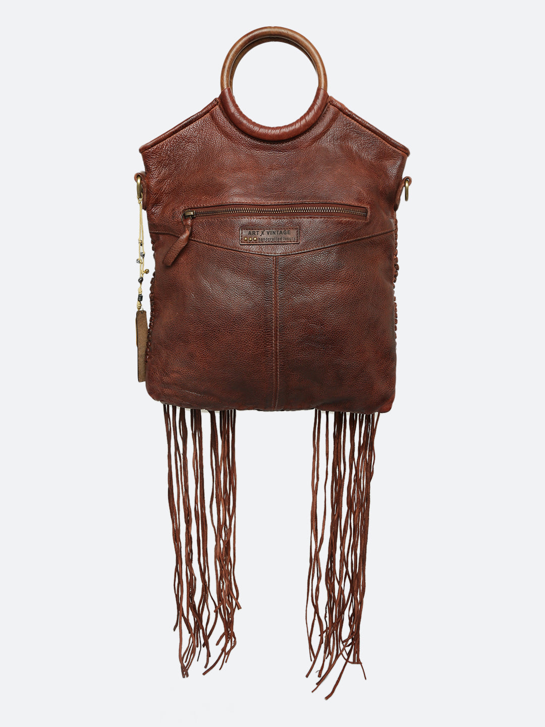 The round wooden handle tote has a main compartment consisting of an inner zip pocket, mobile pocket, slip pocket, and a key holder. An adjustable and detachable handle makes it easy to carry in different ways. This printed and woven boho-fringed style is fashionable workwear to a mundane day. Pep up your look with this stylish bag on a casual day.