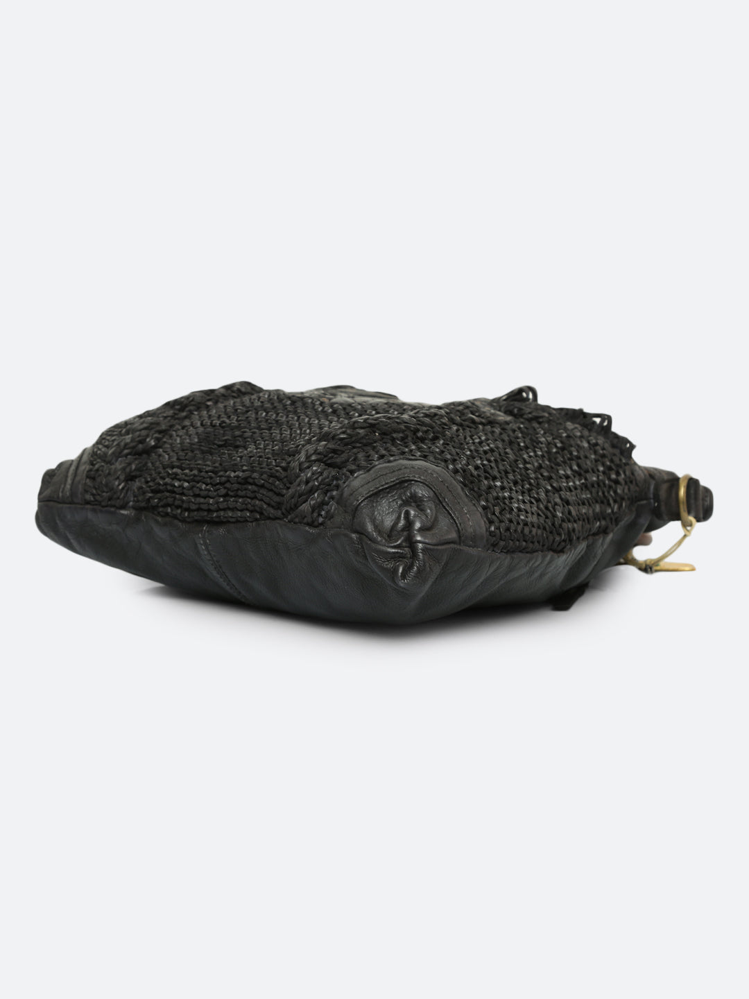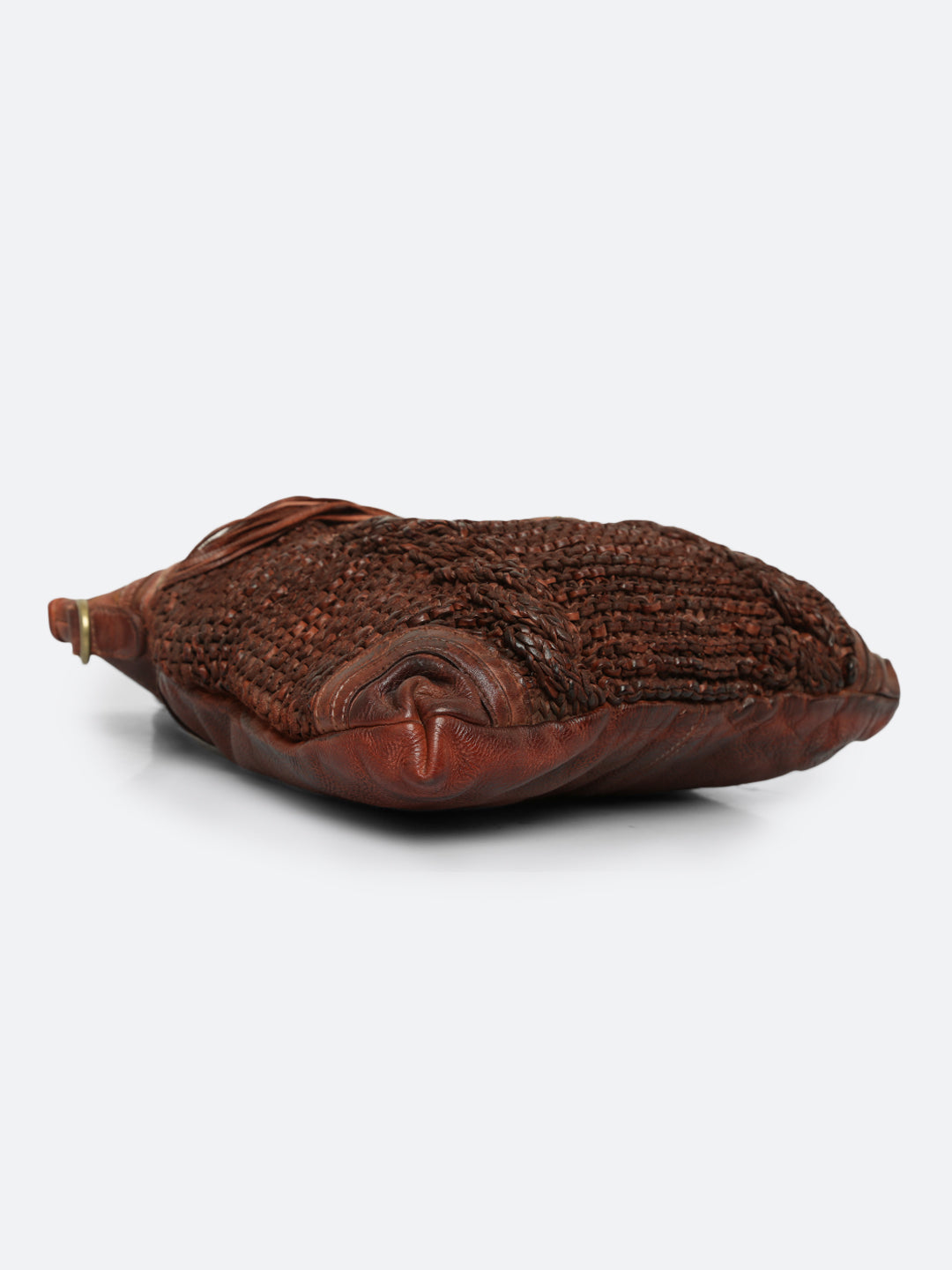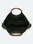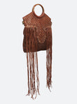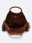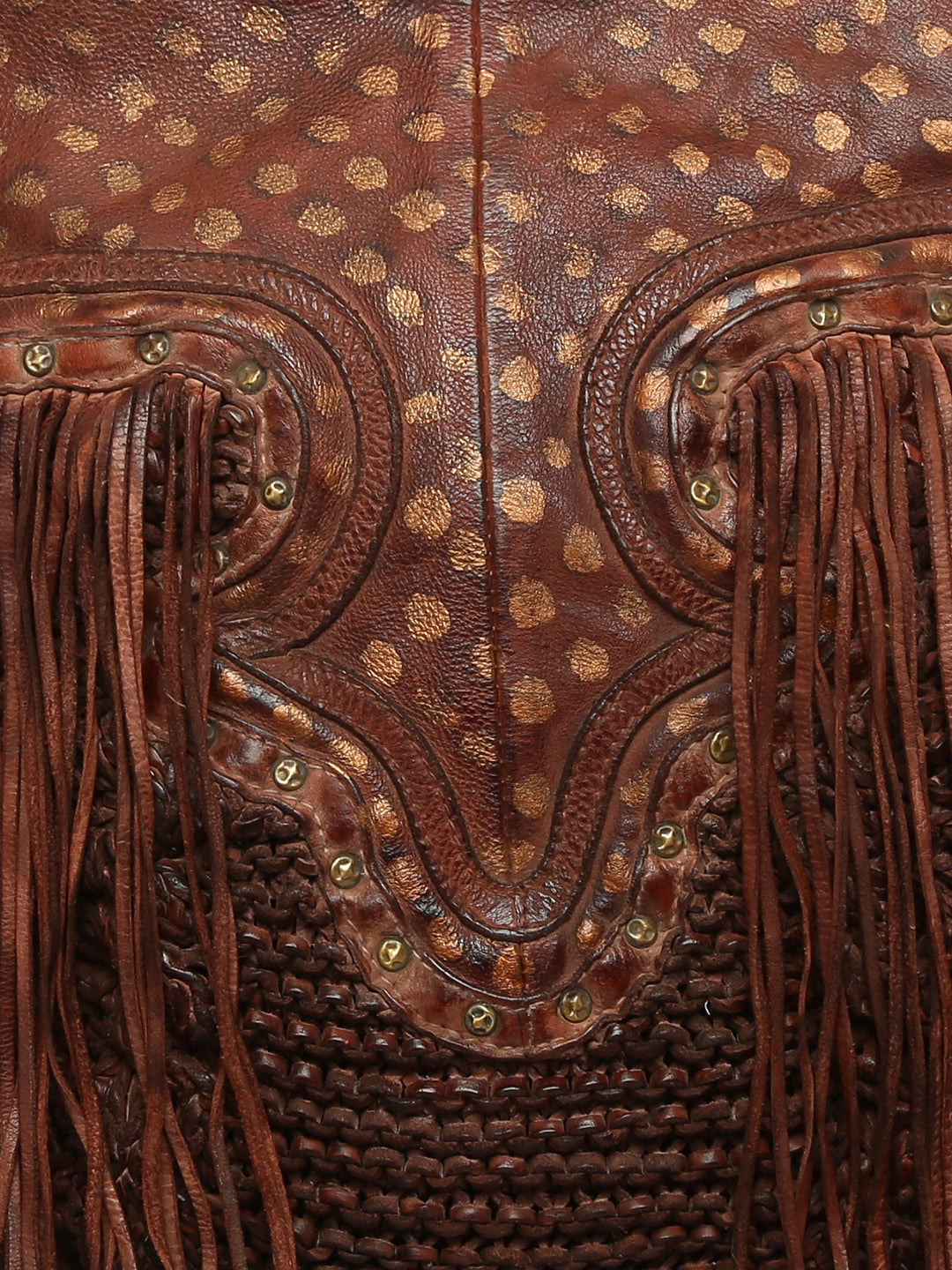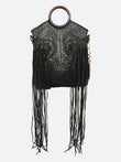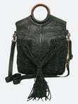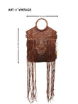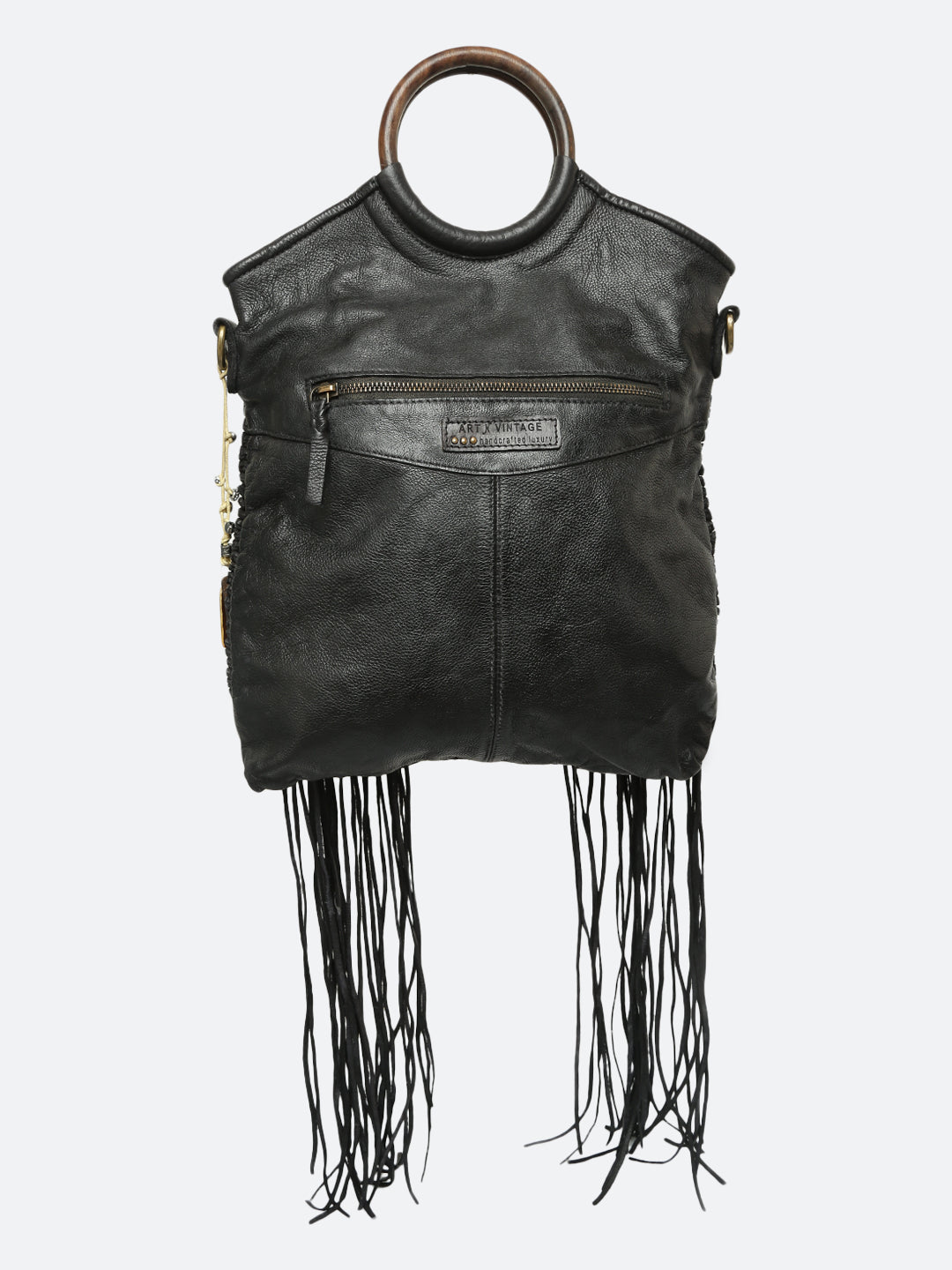 The round wooden handle tote has a main compartment consisting of an inner zip pocket, mobile pocket, slip pocket, and a key holder. An adjustable and detachable handle makes it easy to carry in different ways. This printed and woven boho-fringed style is fashionable workwear to a mundane day. Pep up your look with this stylish bag on a casual day.
