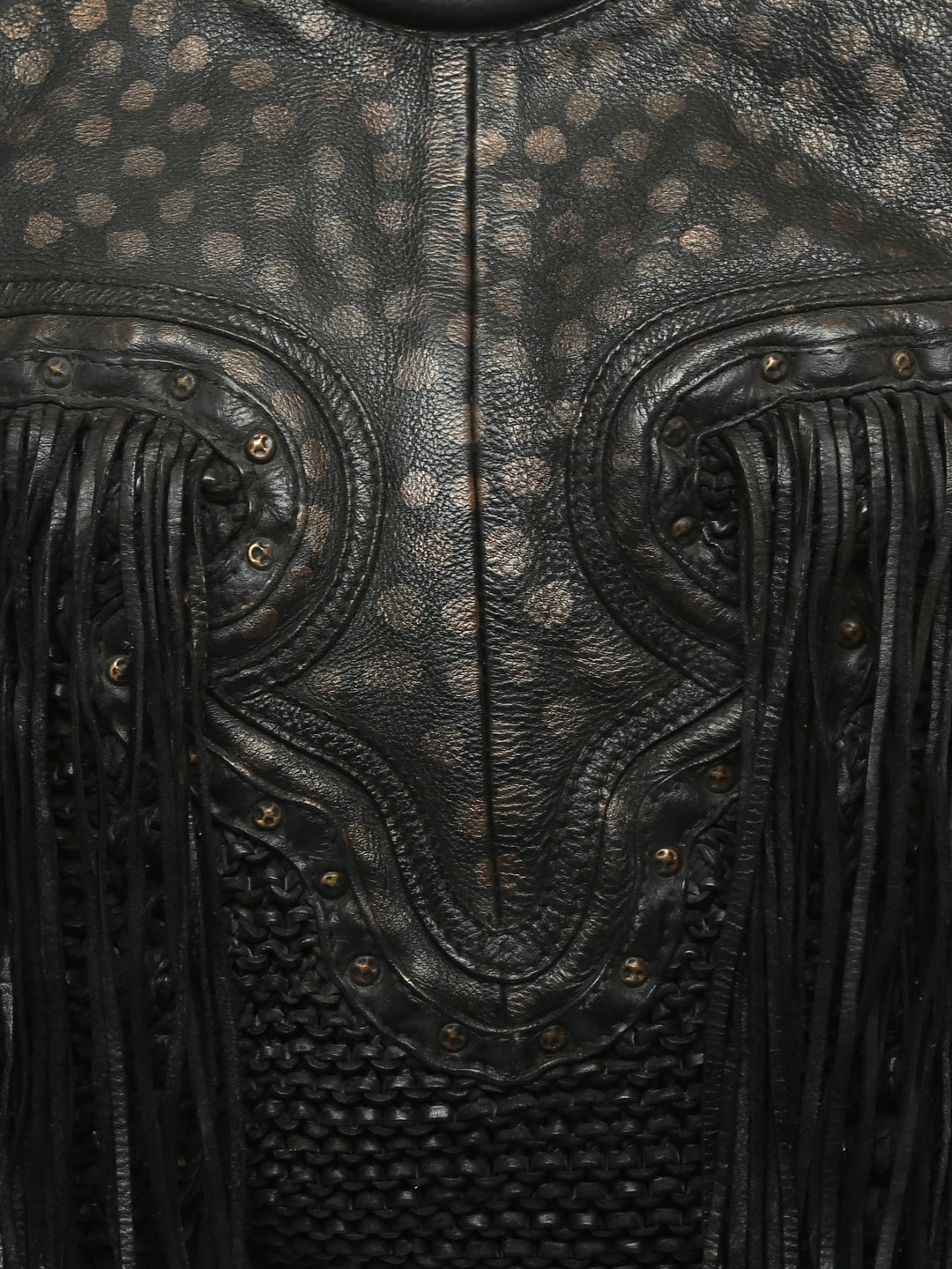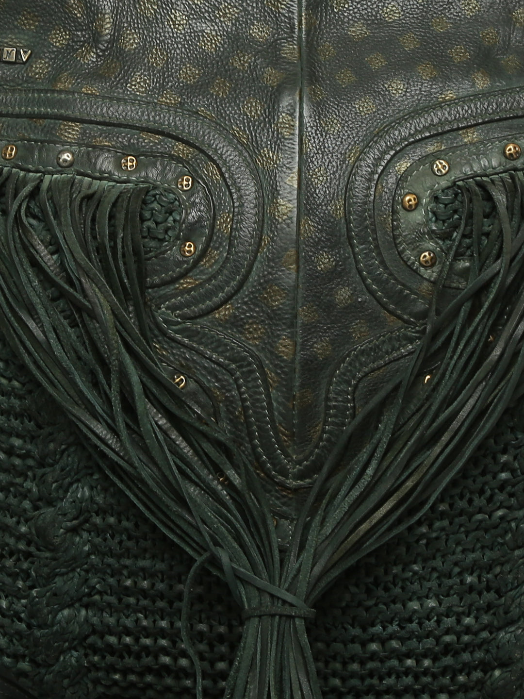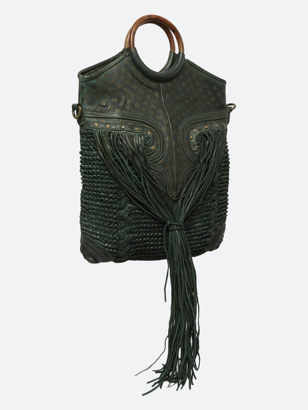 Martinka: Navy Blue Leather Shopper With Wooden Handle With Weaving, Fringes And Metallic Print