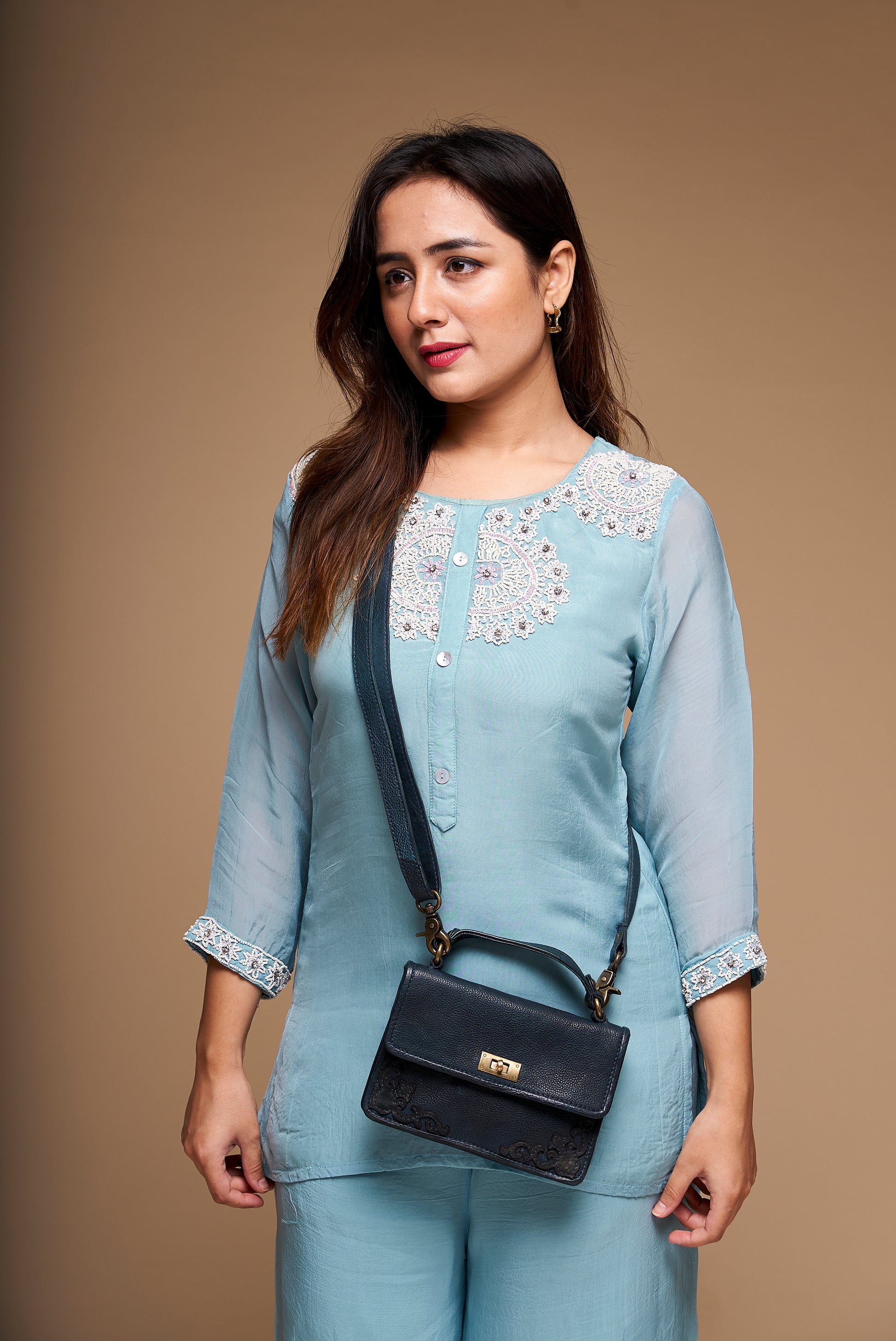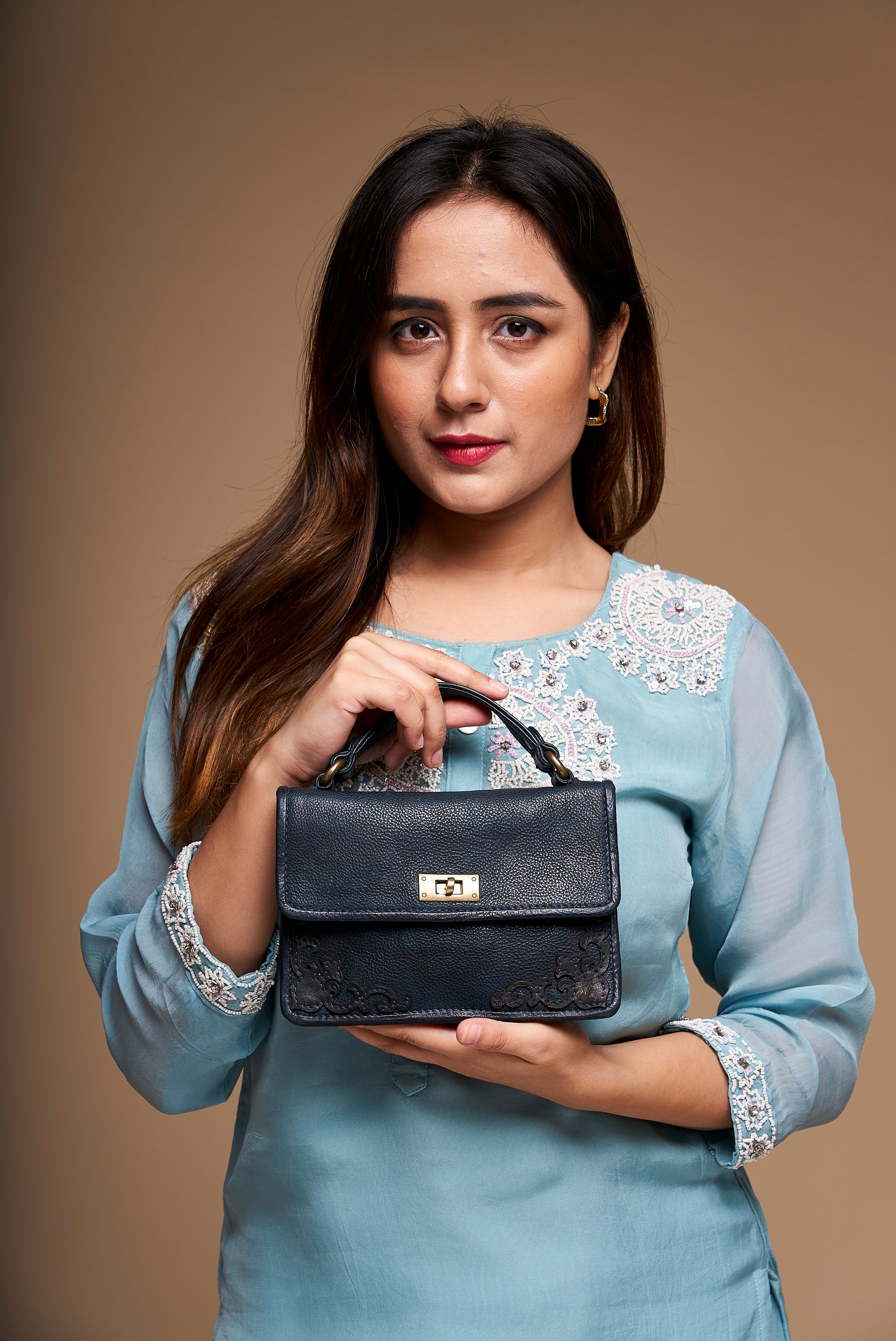 Introducing the Midnight Scroll Mini Leather Crossbody, a timeless handcrafted piece designed with elegant engraved scrollwork detailing on the front flap. Made from rich, premium genuine leather in a deep navy shade, this compact mini sling is the perfect blend of vintage charm and everyday functionality.