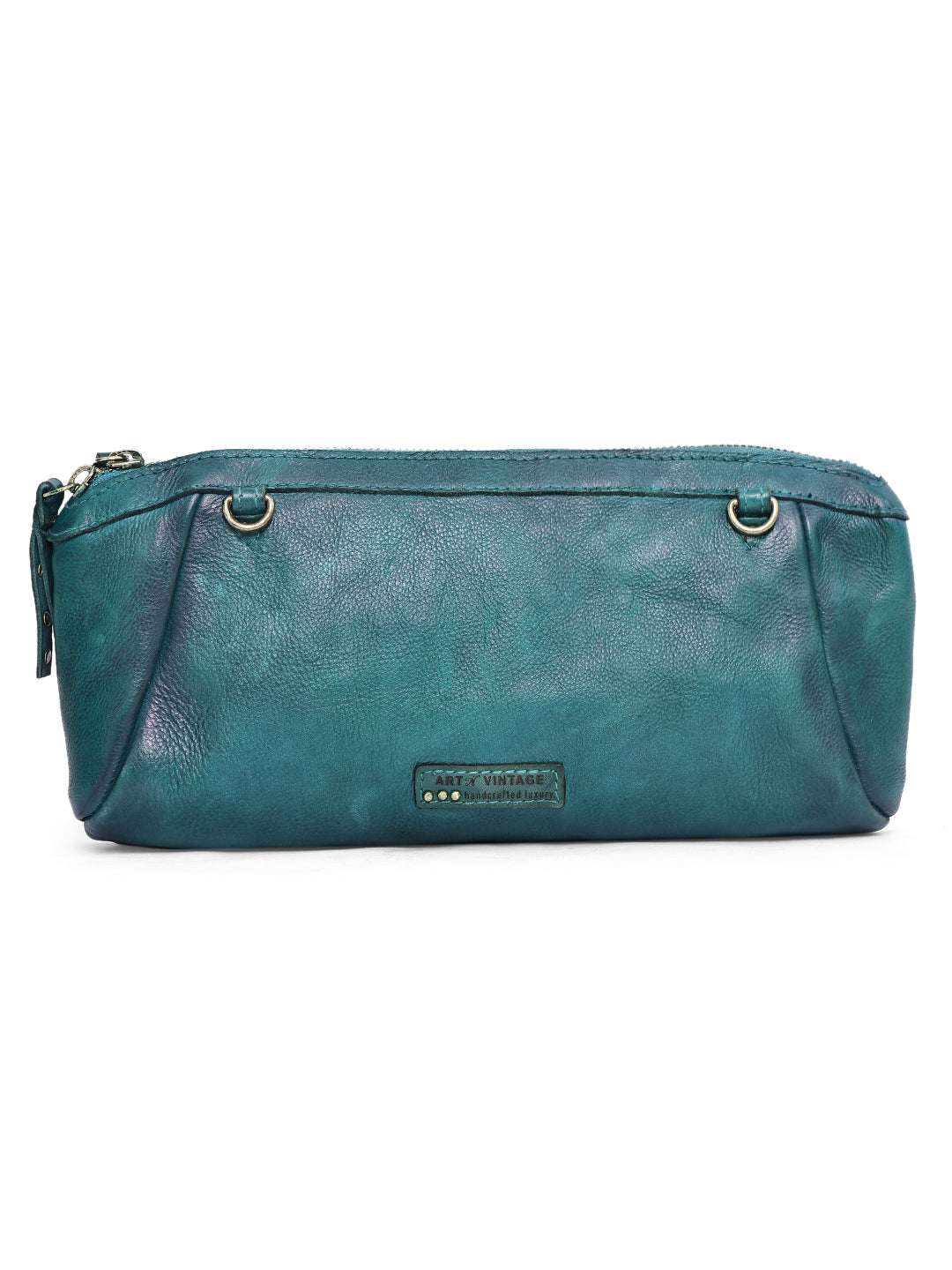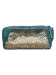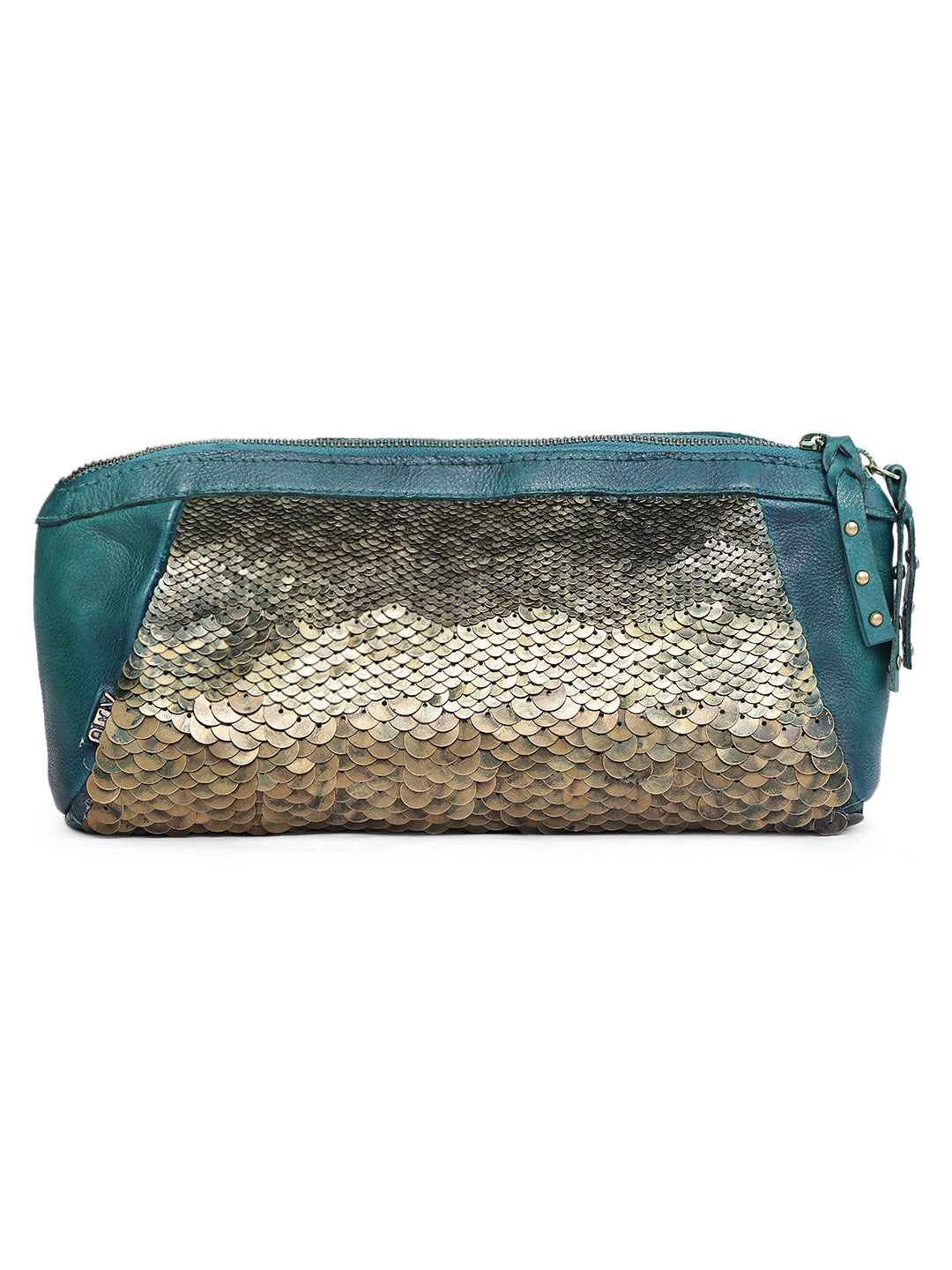 Inspired by the shimmer of ocean waves, the Aqua Royale Scale Clutch is a striking blend of bold texture and refined craftsmanship. The front panel features meticulously hand-applied antique gold metallic scales layered over rich teal genuine leather, creating a mesmerizing gradient effect.