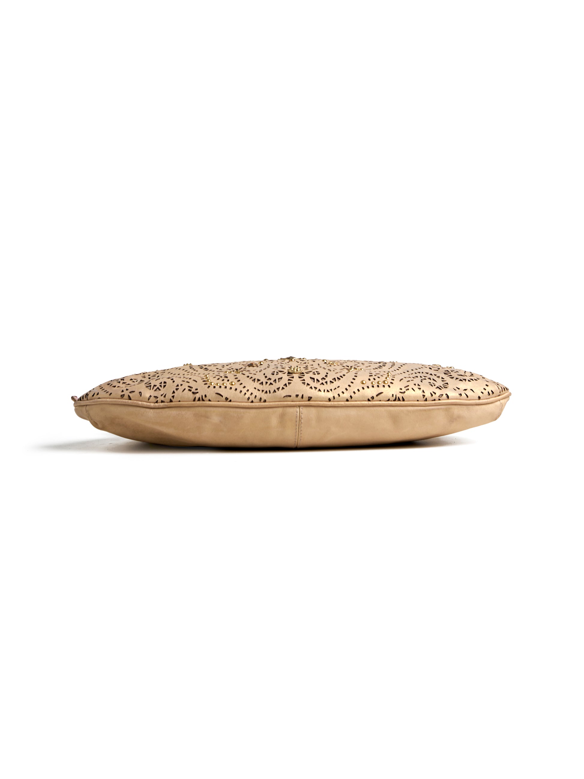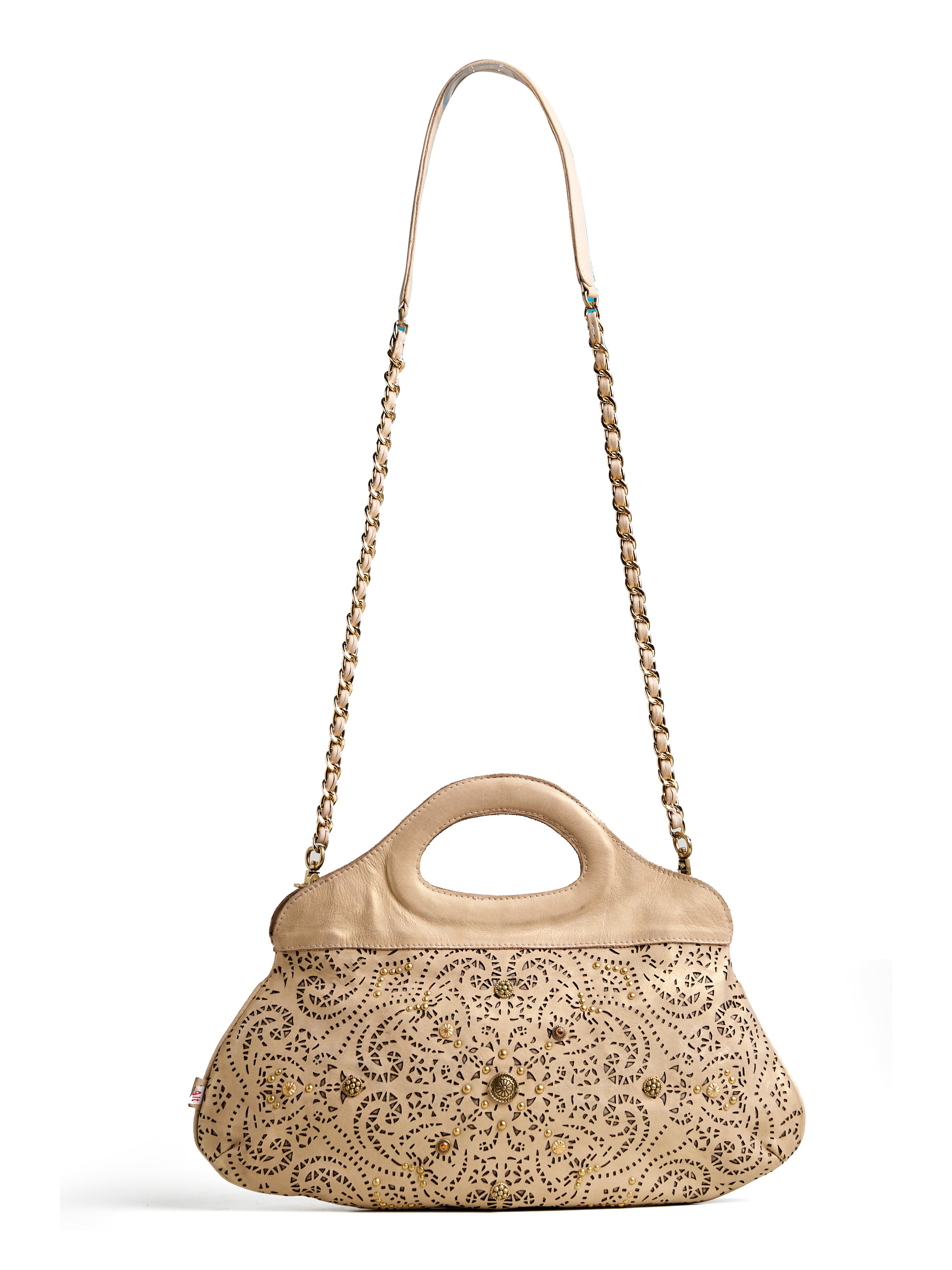 Introducing the Royal Ivory Cutwork Handcrafted Handbag — a perfect celebration of traditional artistry and modern fashion. Designed with exquisite laser-cut floral patterns and elegant golden embellishments, this bag radiates a sophisticated festive charm.