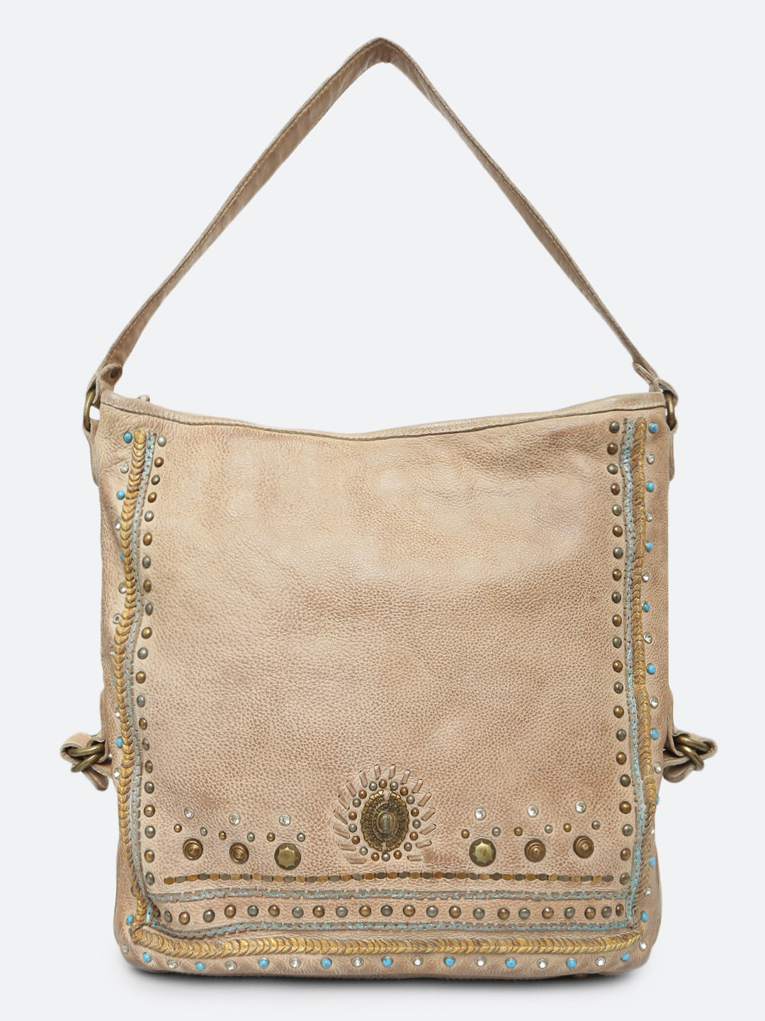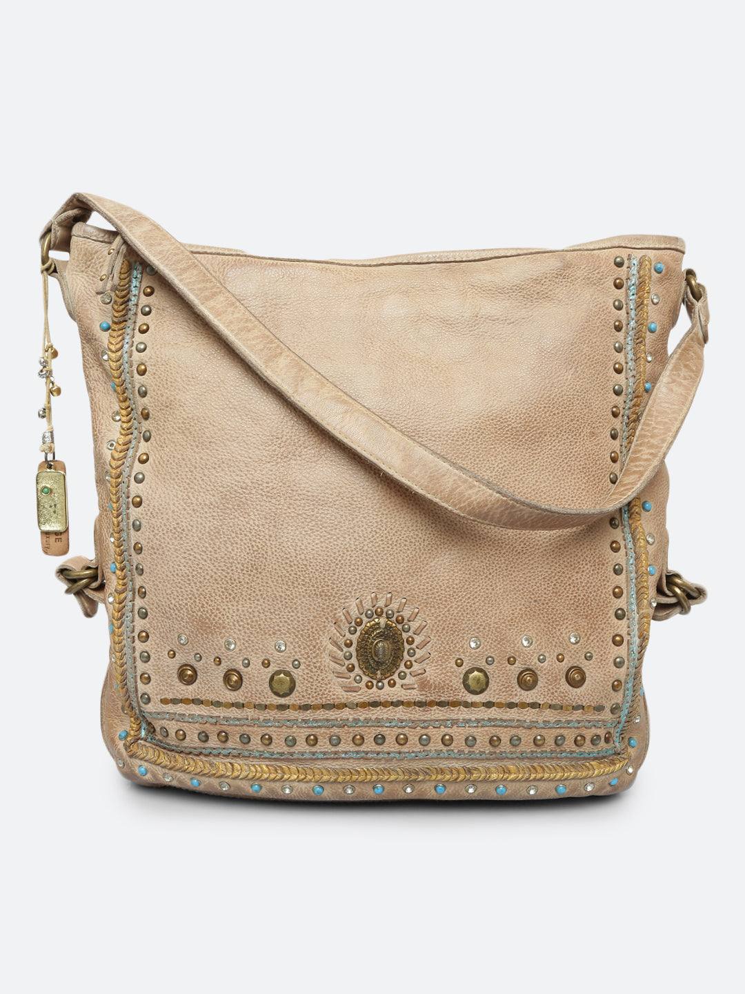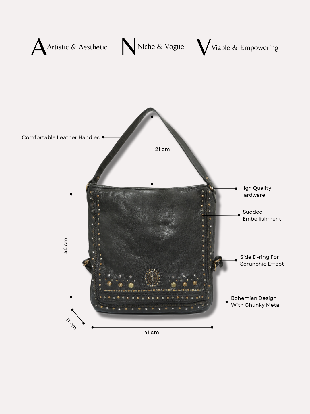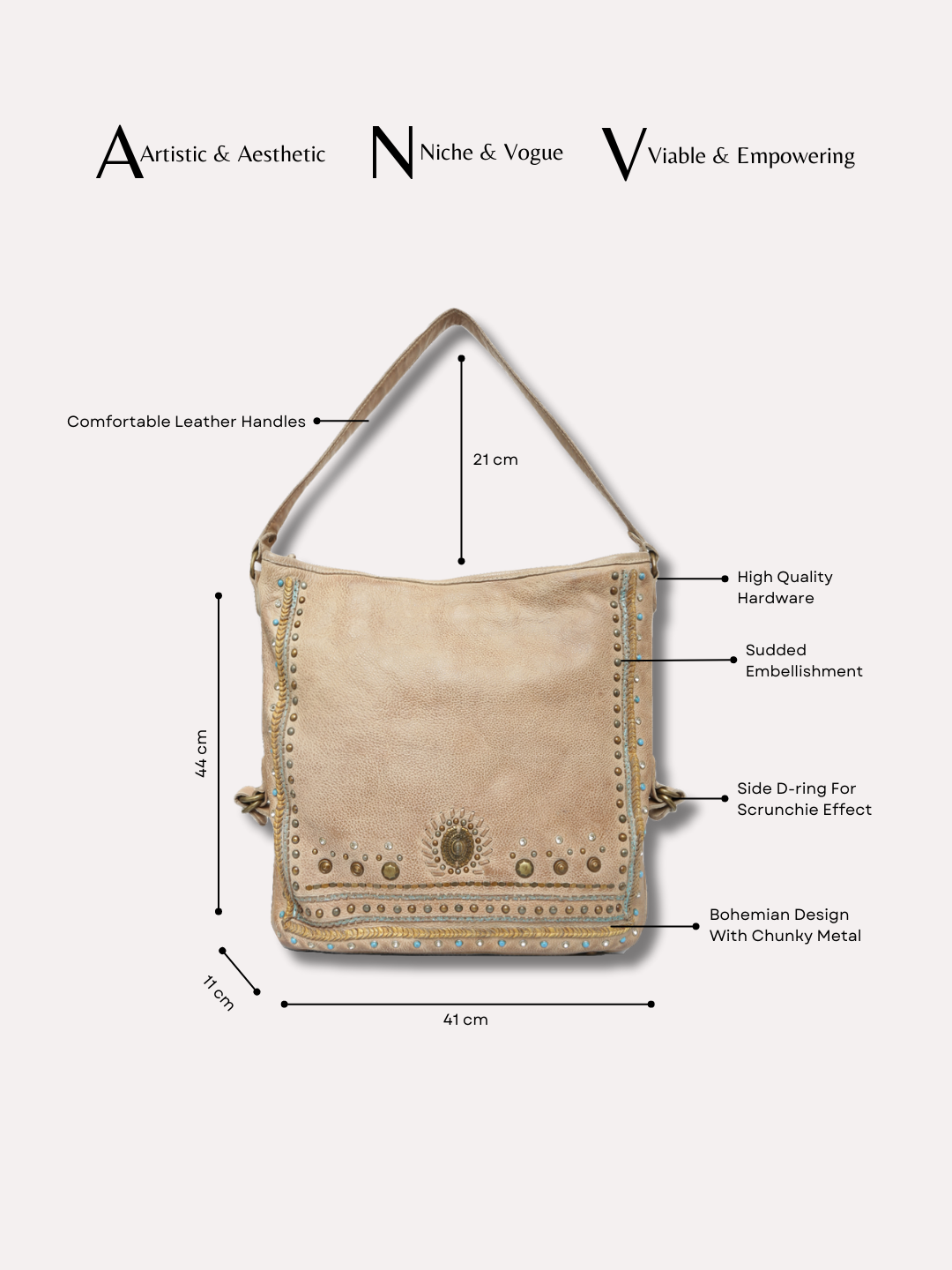 The boho ness of the bag is highlighted by the design and elements that have been put into it. The brass and silver mixed material decorates this bag. The spacious main compartment and zip pockets make it an ideal carry-on while traveling, at work, or as a maternity bag. The lack of a stylish maternity bag is countered with this hobo; now, you can walk with your baby in style and flaunt that bag. This bag has a comfortable handle to be carried on your shoulder easily.