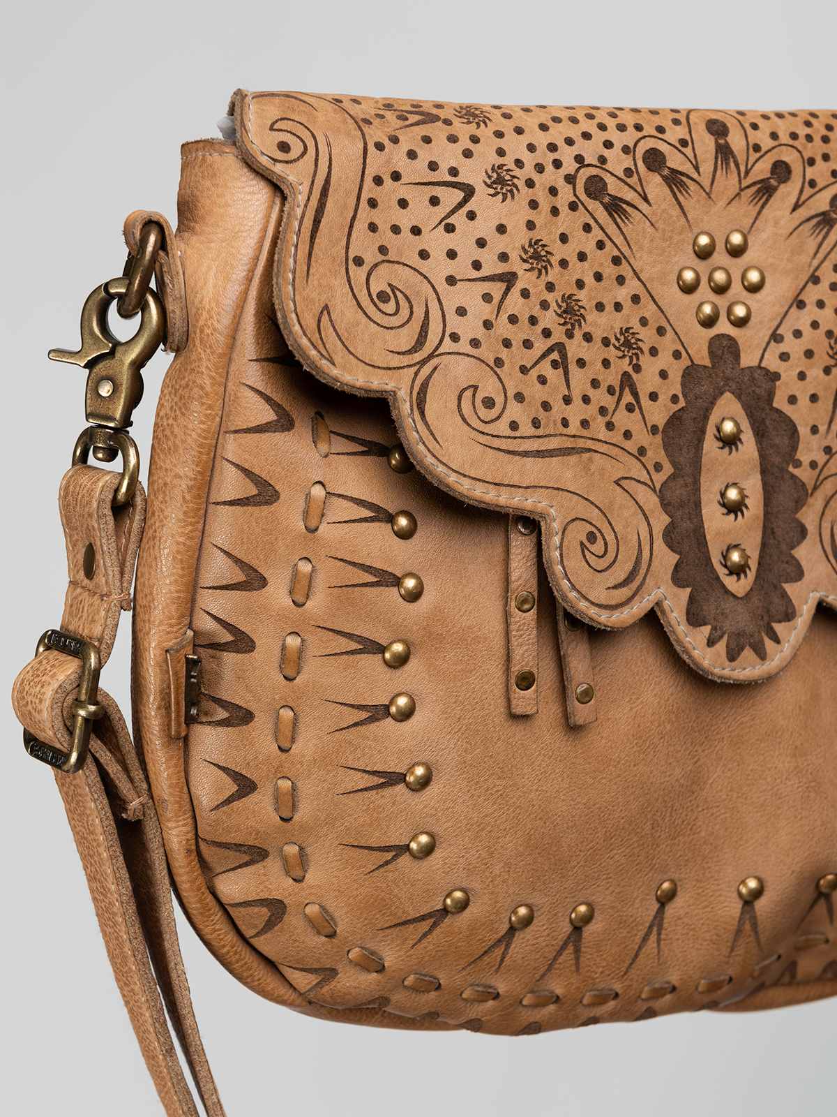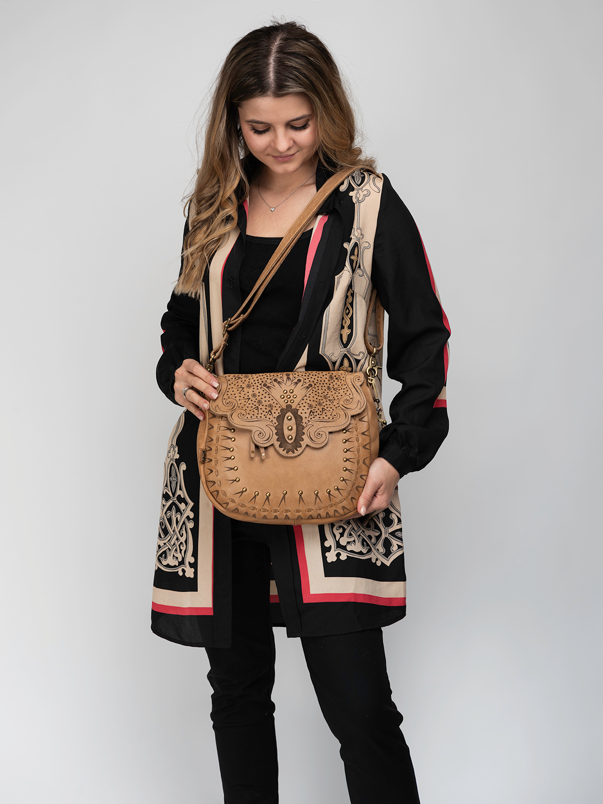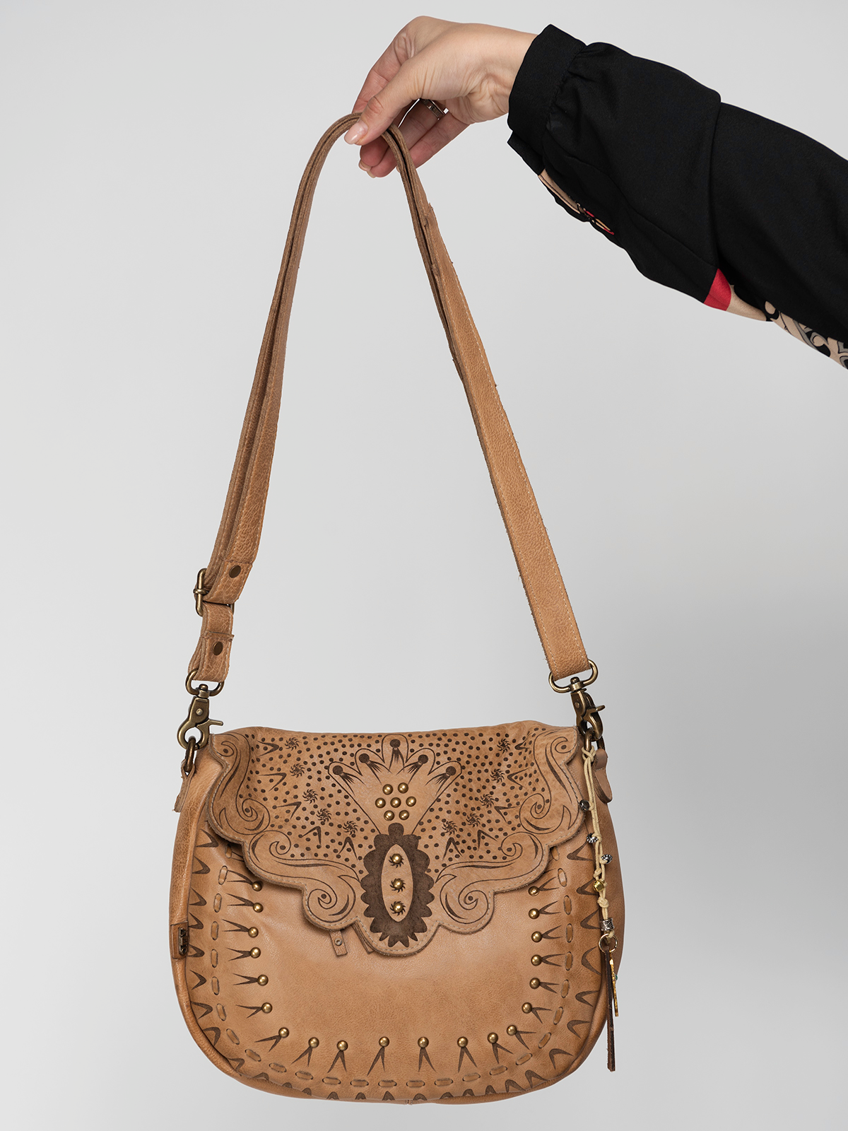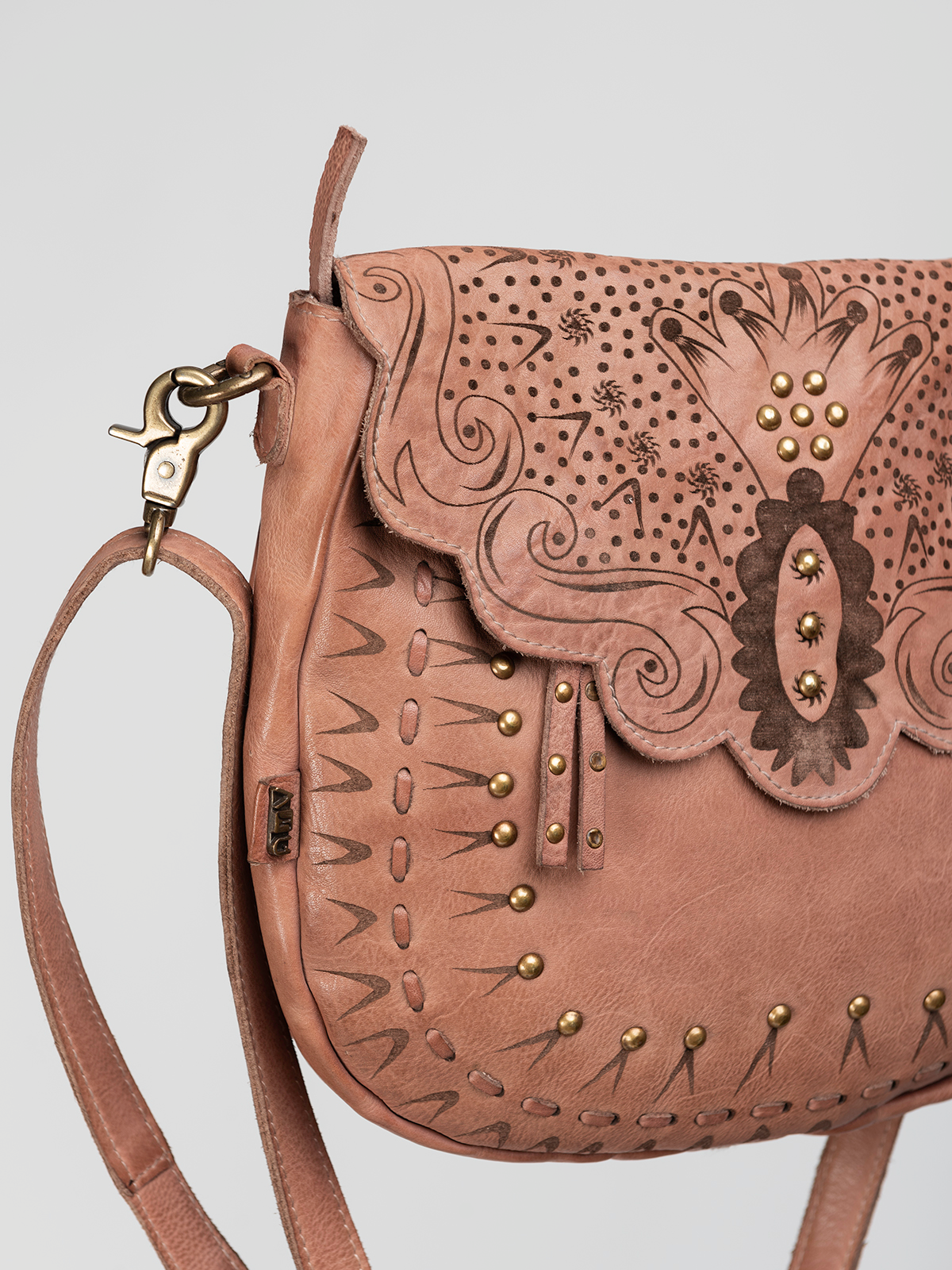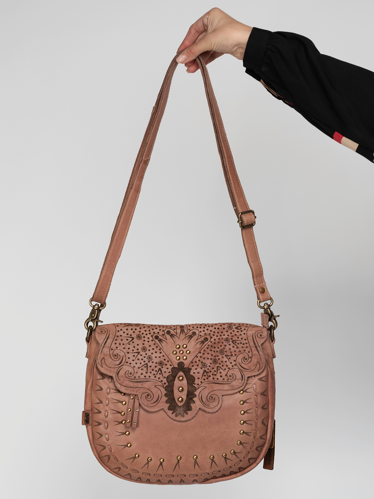This handcrafted leather crossbody bag reflects the true essence of Art N Vintage craftsmanship, combining traditional leather artistry with a timeless boho-inspired design. Made from premium genuine leather, the bag features beautifully hand-tooled patterns on the front flap, enhanced with subtle stud detailing that adds depth, character, and a refined vintage appeal. The soft blush-brown leather tone gives the bag a warm, earthy look that pairs effortlessly with both casual and semi-formal outfits.