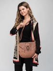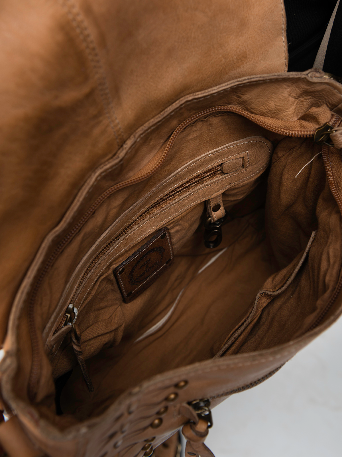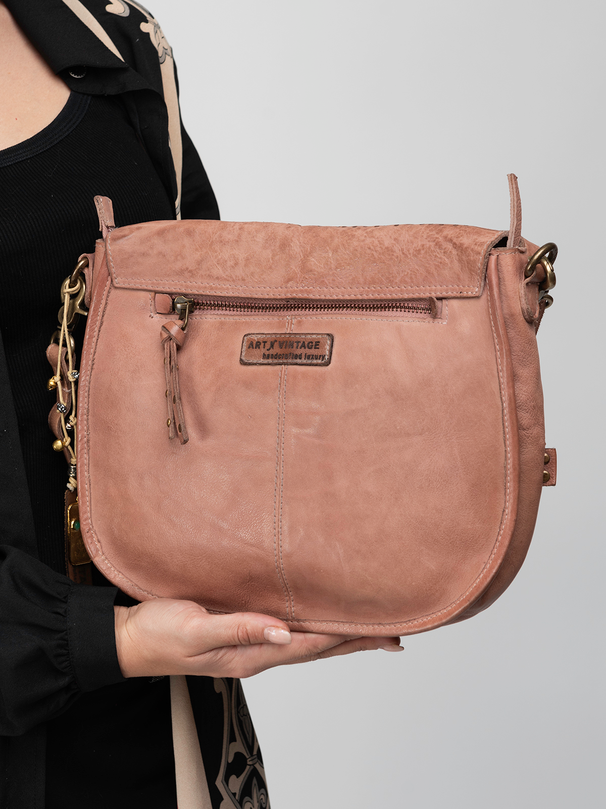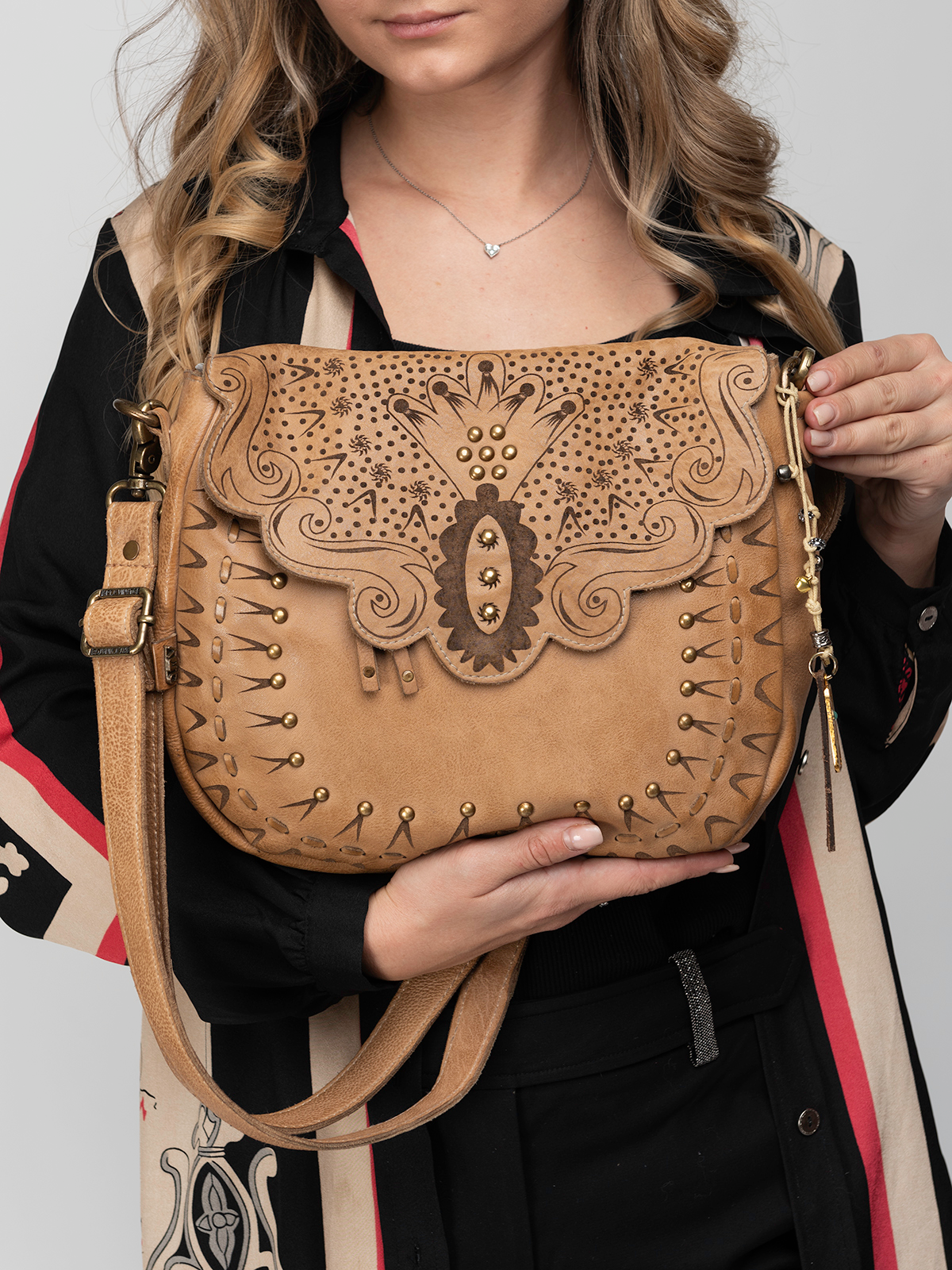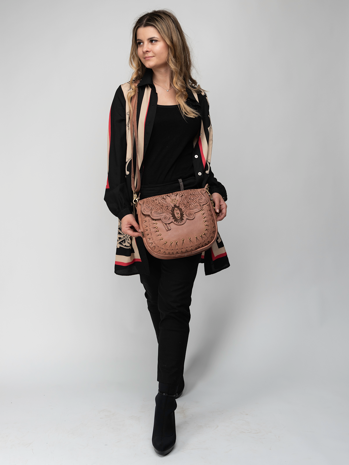 This handcrafted leather crossbody bag reflects the true essence of Art N Vintage craftsmanship, combining traditional leather artistry with a timeless boho-inspired design. Made from premium genuine leather, the bag features beautifully hand-tooled patterns on the front flap, enhanced with subtle stud detailing that adds depth, character, and a refined vintage appeal. The soft blush-brown leather tone gives the bag a warm, earthy look that pairs effortlessly with both casual and semi-formal outfits.